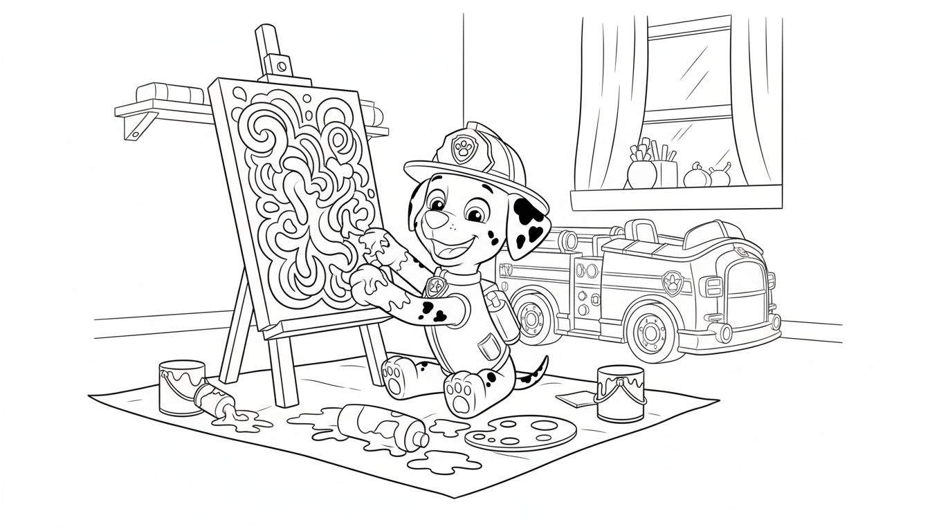 Duik in de creatieve wereld van Marshall met deze leuke Paw Patrol kleurplaat! Marshall, de vrolijke Dalmatiër-brandweerhond, zit besmeurd met verf voor zijn schildersezel. Het doek toont al een abstract kunstwerk van krullen en vormen. Om hem heen liggen schilderbenodigdheden zoals verftubes, een palet en omgevallen verfpotten op een zeil. Op de achtergrond zie je een raam met gordijnen, potten op de vensterbank en Marshalls iconische rode brandweerwagen geparkeerd. Perfect voor jonge artiesten!