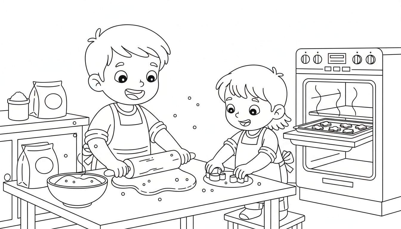 Een zwart-wit kleurplaat met een jongen en een meisje, broer en zus, die samen vrolijk aan het bakken zijn in een keuken. De jongen rolt deeg uit met een deegroller, terwijl het meisje met uitsteekvormpjes koekjes maakt. Bakbenodigdheden en een oven met bakende koekjes completeren de scène.