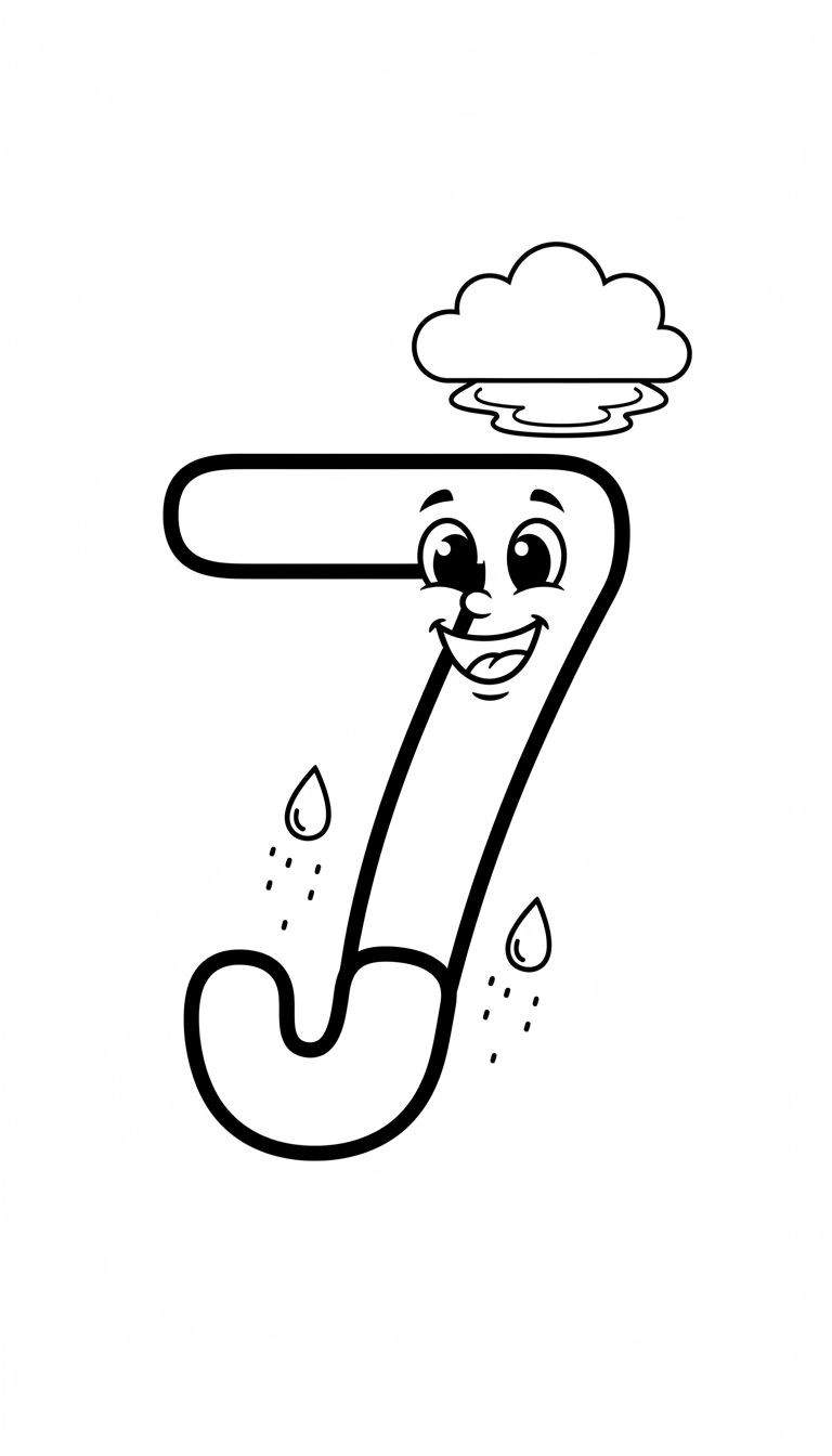 Ontdek deze schattige zwart-wit kleurplaat van het cijfer 7. Het cijfer is geanimeerd met een vrolijk, lachend gezicht, grote ogen, een neus en een brede mond. Boven het cijfer zweeft een zachte wolk waaruit speelse regendruppels vallen, variërend van grote druppels tot kleine stippels. Een eenvoudig en vrolijk ontwerp, perfect voor jonge kinderen om te kleuren.