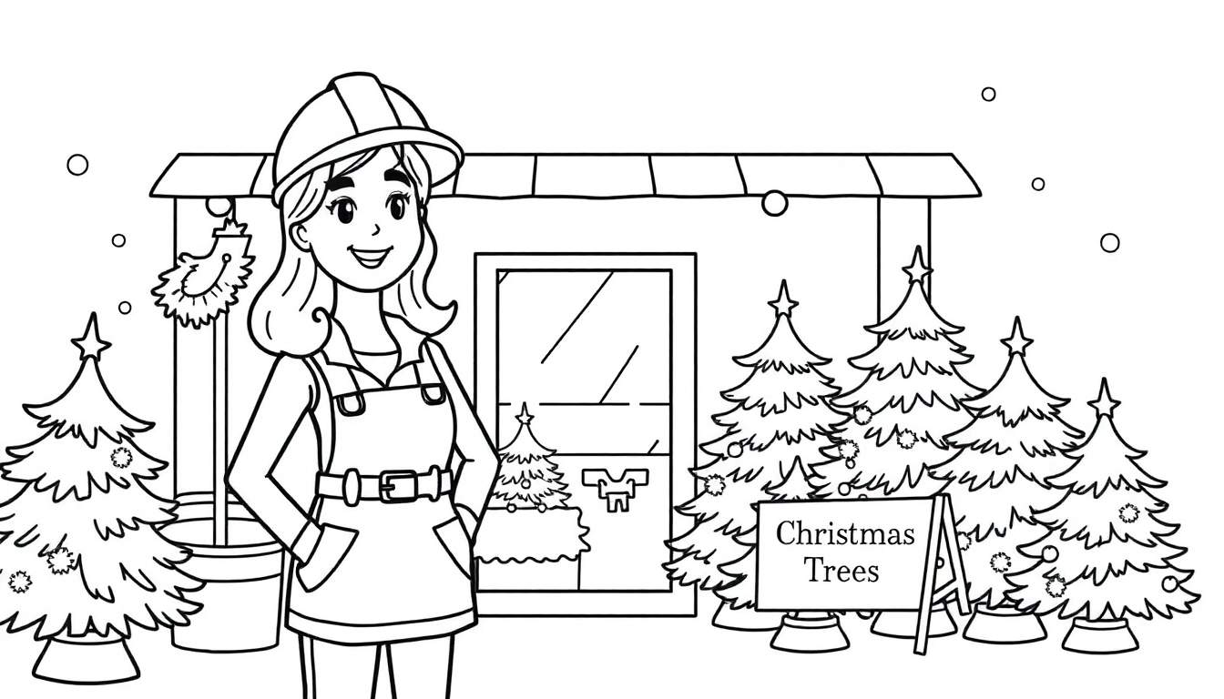 Een sfeervolle zwart-wit kleurplaat die een levendige kerstbomenverkoop of winterse setting weergeeft. Centraal staat een lachende vrouw in werkkleding met een bouwhelm, omringd door kerstbomen, een ouderwetse waterput en een gezellig huisje. Perfect voor jong en oud om in kerstsfeer te kleuren!