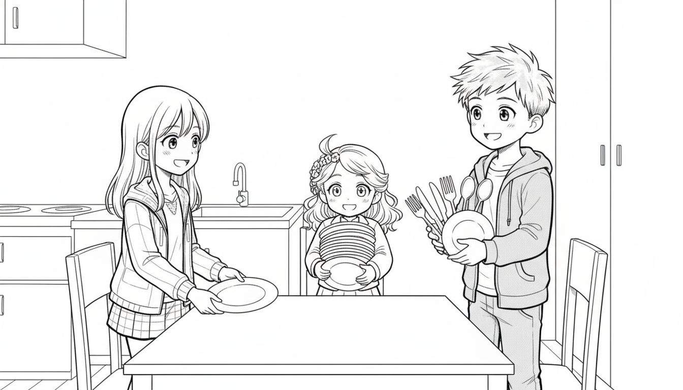 Dit charmante zwart-wit lijntekening, speciaal ontworpen als kleurplaat, toont een hartverwarmend tafereel van drie kinderen die vol ijver de tafel dekken in een gezellige keuken. Links zien we een meisje met lang haar, gekleed in een jasje en geruit rokje, die zorgvuldig een bord op tafel plaatst, terwijl haar glimlach pure vreugde uitstraalt. Achter haar tekenen de elementen van een keuken zich af: een aanrecht met kookplaten en een gootsteen. In het midden staat een jonger meisje met een schattige bloem in haar krullende haar, die met beide handen een imposante stapel schone borden draagt en een vrolijke blik deelt. Rechts completeert een jongen met stekelig haar het tafereel, terwijl hij een bord met diverse besteksoorten – vorken, lepels en messen – vasthoudt, ook met een brede glimlach. Achter hem zien we een keukenkast, die het gezellige tafereel aanvult. Alle drie de kinderen stralen een aanstekelijke vrolijkheid uit en laten zien hoe prettig het is om samen te werken.