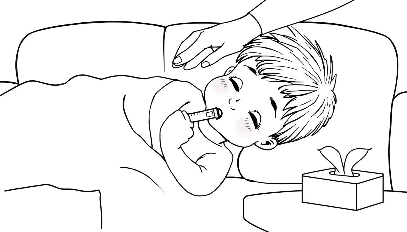 Kleurplaat van een ziek kind dat in bed ligt met een thermometer in de mond. Een zorgzame hand rust geruststellend op de rug. Naast het bed staat een doos tissues. Een mooie kleurplaat om te praten over ziek zijn en zorgzaamheid.