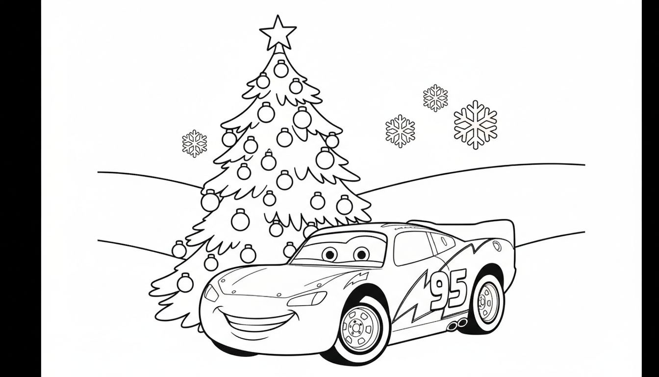 Welkom bij deze vrolijke zwart-wit kleurplaat die de geliefde raceauto Bliksem McQueen in een magische winterse sfeer plaatst! De iconische nummer 95 staat vooraan, met een brede glimlach die de feestvreugde uitstraalt. Achter hem prijkt een prachtig versierde kerstboom, rijkelijk belegd met glimmende kerstballen en bekroond met een fonkelende ster. Overal om hen heen dwarrelen sierlijke sneeuwvlokken, en het landschap is bedekt met een zachte laag sneeuw, gesuggereerd door glooiende lijnen die winterse heuvels of sneeuwhopen voorstellen. Deze kleurplaat brengt gegarandeerd uren tekenplezier en de kerstsfeer in huis, ideaal voor jonge racefans en liefhebbers van de Cars-films.