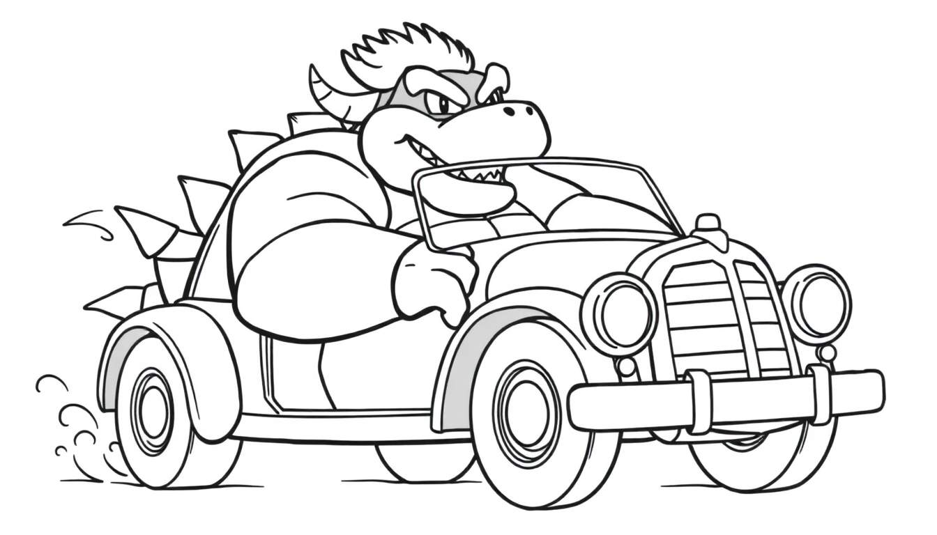 **Leuk weetje:** Hoewel Bowser meestal bekend staat om zijn dreigende fort en magische krachten, toont deze kleurplaat een meer speelse en misschien zelfs een beetje een ‘bad boy’-kant van hem. Het idee van Bowser die achter het stuur van een klassieke auto zit, is een leuke knipoog naar zijn persoonlijkheid en de vele avonturen die hij beleeft in de Mario-franchise.