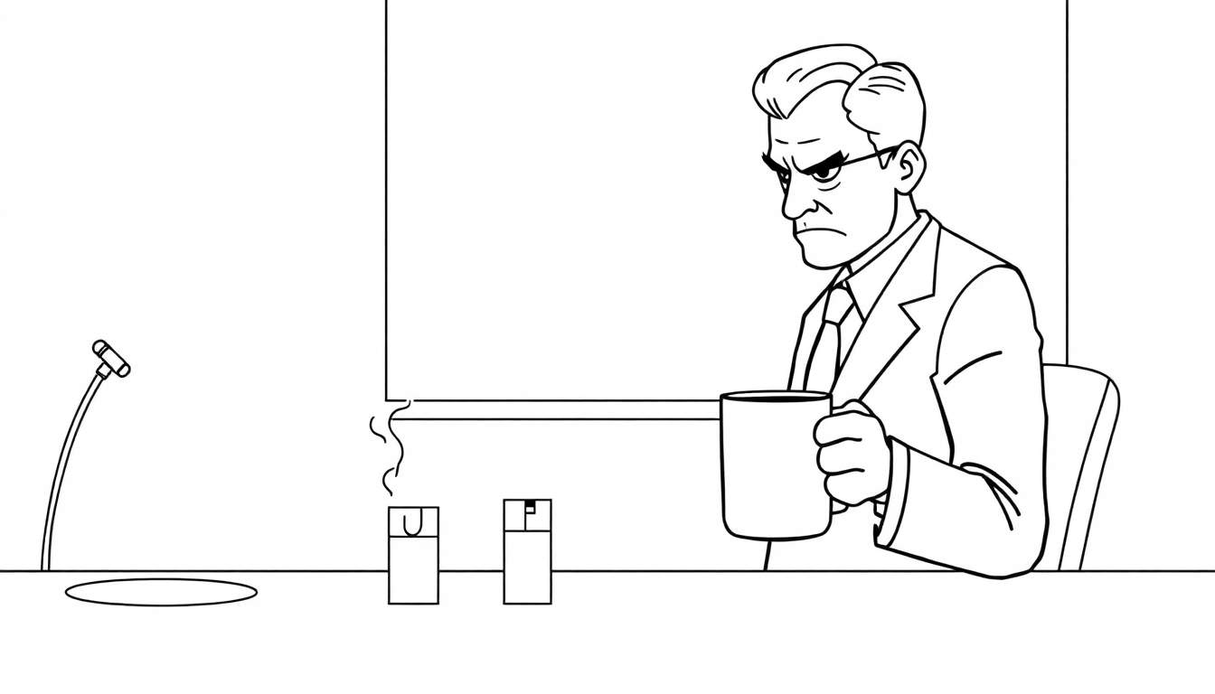Deze intrigerende kleurplaat nodigt u uit om een moment van gespannen stilte tot leven te brengen. Centraal staat een man, wiens serieuze, zelfs geërgerde gezichtsuitdrukking direct de aandacht trekt. Gekleed in een formeel pak, compleet met das, straalt hij een zekere autoriteit uit, maar de gefronste wenkbrauwen en de intense blik suggereren een onderliggende frustratie. Zijn rechterhand omklemt een eenvoudige mok, mogelijk een teken van een lange werkdag of een moment van reflectie voor een cruciale taak. De omgeving is net zo suggestief: een microfoon voor potentiële spraak, een rokende asbak die de sombere sfeer versterkt, en een pennenhouder die de aanwezigheid van werk benadrukt. Het geheel, weergegeven in een duidelijke cartoonstijl, creëert een scène die both herkenbaar en intrigerend is.