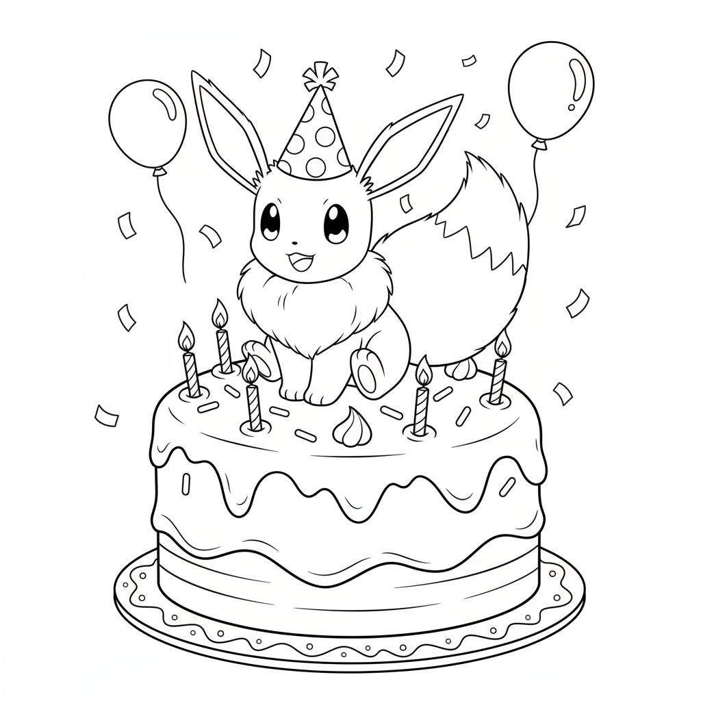 Laat je creativiteit de vrije loop met deze betoverende kleurplaat van Eevee, de geliefde “Evolutie Pokémon”, die haar verjaardag viert! Eevee straalt van plezier, compleet met een vrolijke puntmuts en een brede glimlach, terwijl ze triomfantelijk bovenop een prachtige, twee-laagse verjaardagstaart zit. Rondom haar zweven feestelijke ballonnen en dwarrelende confetti, wat de algehele sfeer van vreugde en viering perfect vastlegt. Deze plaat is een uitnodiging om met kleuren de vrolijkheid van dit speciale moment te benadrukken.