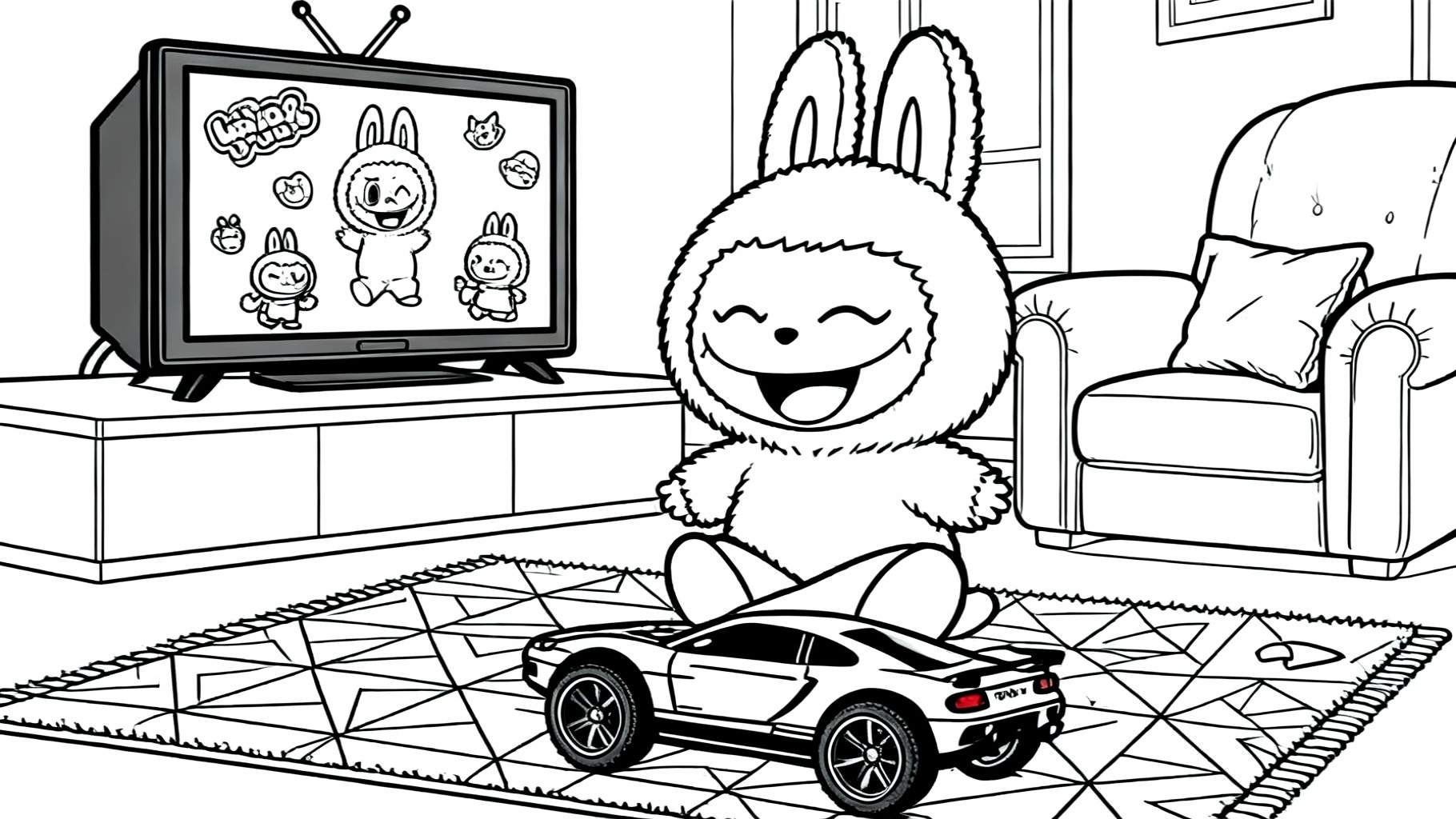 Gezellige Labubu Kleurplaat: Konijn Kijkt Tekenfilm met Speelgoedauto