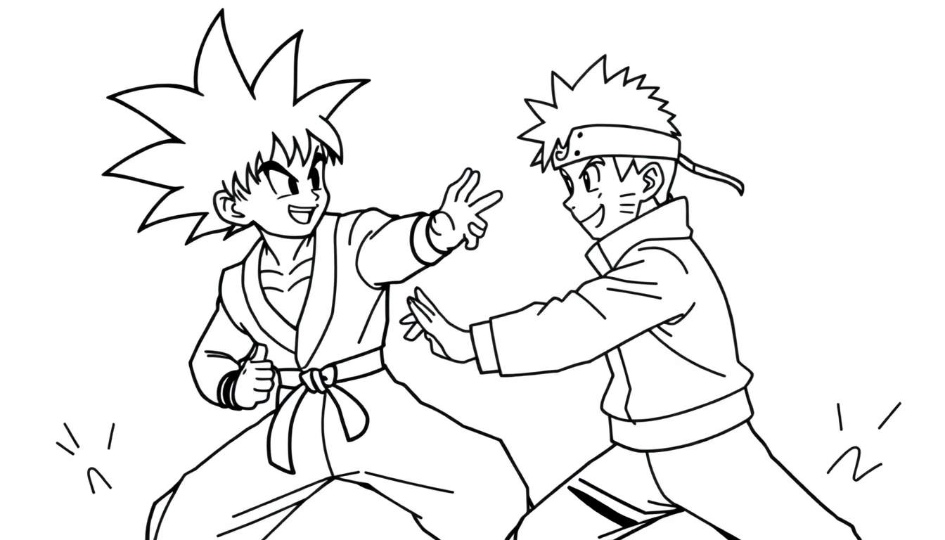 Download deze leuke kleurplaat met een zwart-witte lijntekening van de iconische animehelden Goku uit Dragon Ball en Naruto uit Naruto, die een vriendschappelijke uitdaging aangaan. Perfect voor fans van beide series om in te kleuren!