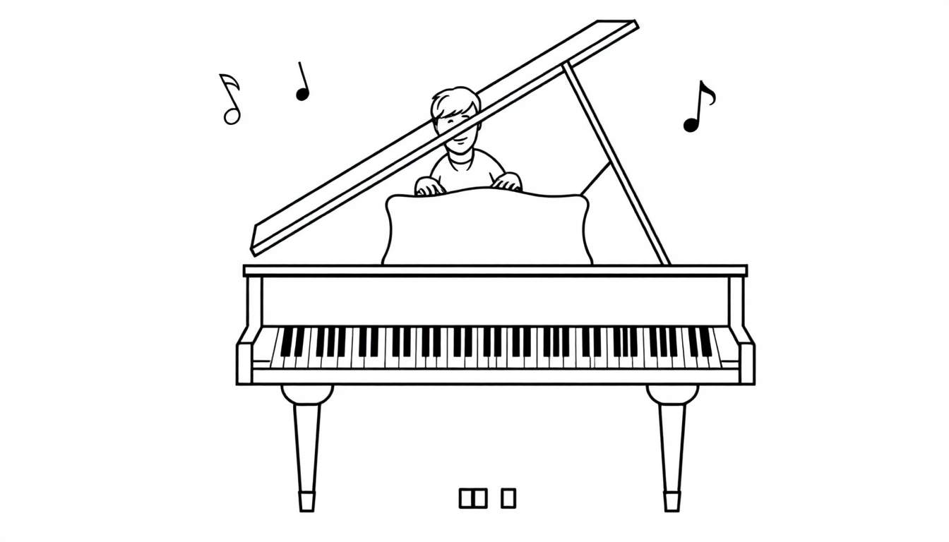 Een eenvoudige zwart-wit lijntekening kleurplaat van een jongen die achter een piano speelt. Boven de vleugel zweven vrolijke muzieknoten, wat de sfeer van muziek maken weergeeft. Perfect om de creativiteit van kinderen te stimuleren.