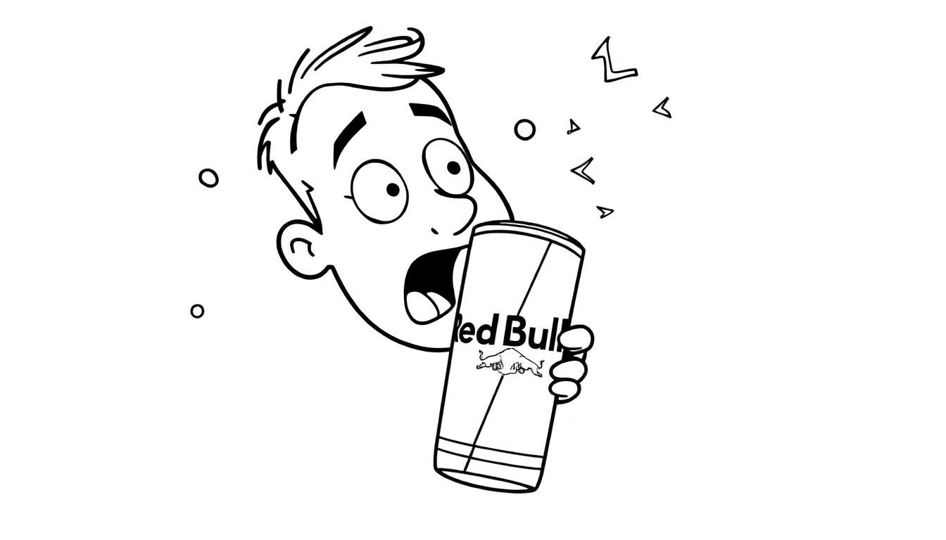 Een zwart-wit lijntekening van een man met wijd opengesperde ogen en een open mond die een blikje Red Bull drinkt. Abstracte vormen en energieke lijnen omringen hem, wat de intense reactie op de energieboost weergeeft.