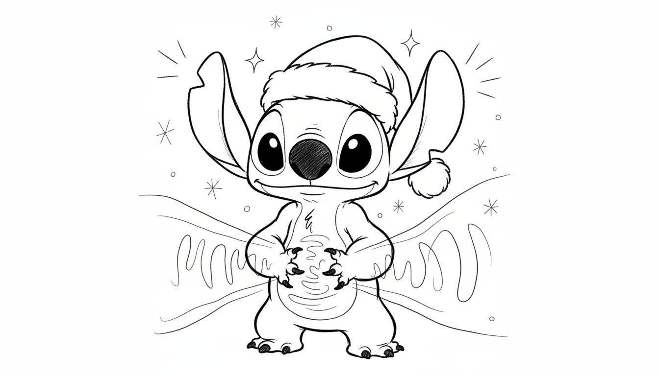 Een vrolijke zwart-wit kleurplaat van Stitch uit Lilo & Stitch, compleet met kerstmuts en omringd door sterren en sneeuwvlokken. Perfect voor de feestdagen!