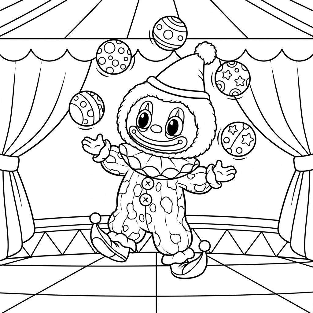 De gedetailleerde omgeving van de circustent, compleet met golvende gordijnen, een gestructureerde nok en een dynamische geruite vloer, biedt talloze mogelijkheden voor kleurkeuzes. Let ook op de vijf unieke jongleerballen, elk versierd met stippen, strepen of sterren. Deze kleurplaat is niet alleen een leuke activiteit, maar ook een kans om de levendige sfeer van een circusvoorstelling in huis te halen, wellicht geïnspireerd op de speelse energie van Labubu-achtige figuren.