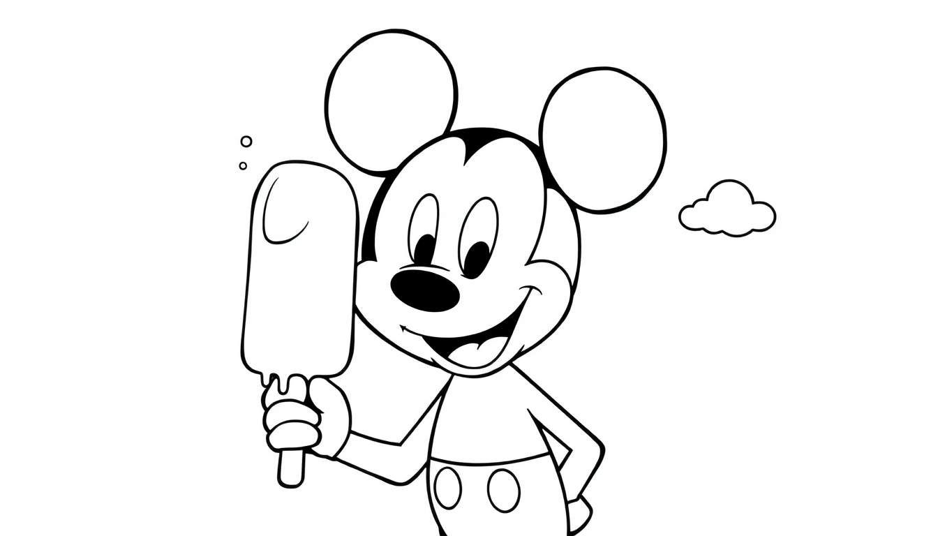Een vrolijke zwart-wit lijntekening van Mickey Mouse die geniet van een smeltend ijsje. Perfect voor kinderen om in te kleuren!