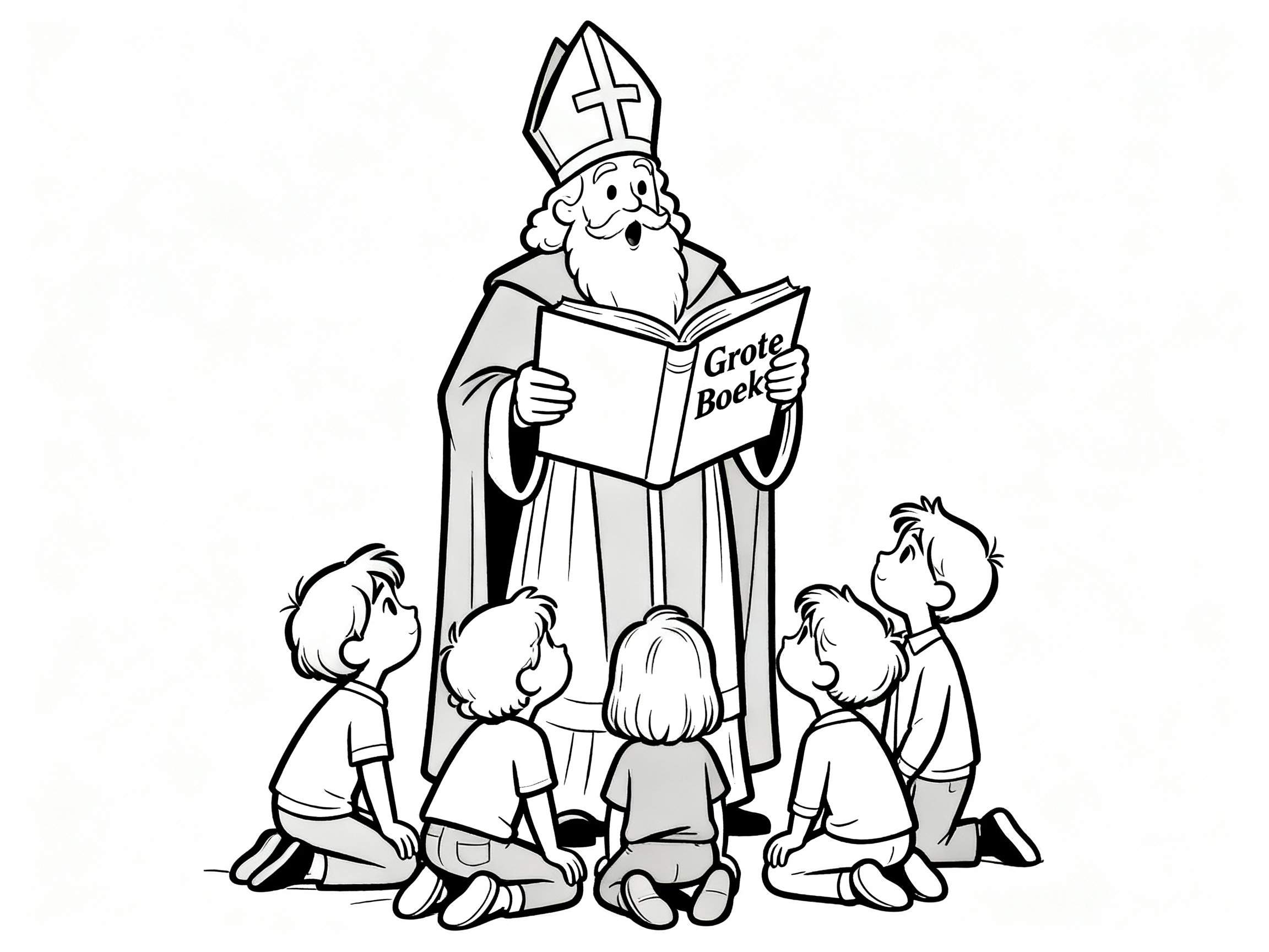 Ontdek deze hartverwarmende zwart-wit kleurplaat van Sinterklaas die aandachtig voorleest uit het Grote Boek aan een groepje van zes luisterende kinderen. Sinterklaas, gekleed in zijn traditionele gewaad met mijter (met een kruis) en volle witte baard, staat centraal, omringd door kinderen die vol verwondering toekijken. Deze cartooneske en vriendelijke tekening vangt de magie van het Sinterklaasverhaal en de gezellige sfeer perfect voor de feestdagen. Ideaal voor kleuters en basisschoolkinderen om in te kleuren.