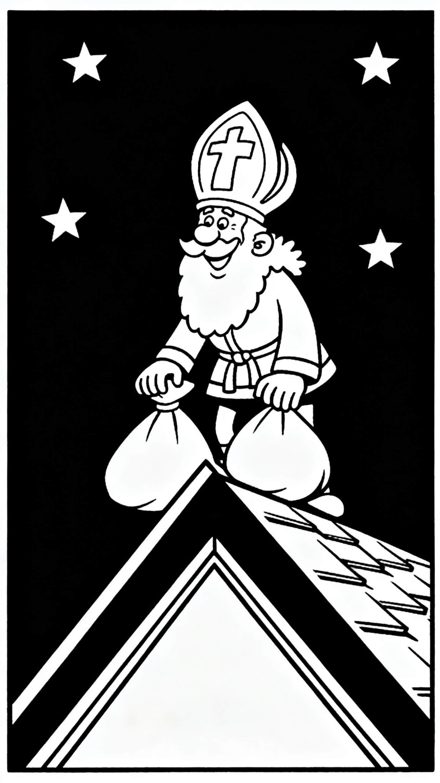 Deze vrolijke zwart-witte kleurplaat toont Sinterklaas staand op een schuin pannendak, klaar om cadeautjes te bezorgen. Met zijn iconische mijter, lange witte baard en lachend gezicht, houdt hij twee grote, volle zakken vast. De pikzwarte nachtelijke achtergrond met vier fonkelende sterren benadrukt de magische sfeer van de pakjesavond. Een heldere, cartoonachtige tekening, perfect voor kinderen om in te kleuren.