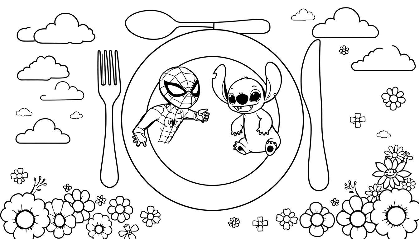 Deze unieke zwart-witte lijntekening nodigt kinderen uit om hun creativiteit de vrije loop te laten met twee geliefde personages: de webslingeraar Spider-Man en de buitenaardse Stitch. De scène speelt zich af rond een gedekte tafel, compleet met een groot bord, een vork, lepel en mes. Aan de ene kant van het bord prijkt een schattige, kinderlijke versie van Spider-Man in zijn iconische pak, terwijl aan de andere kant Stitch, met zijn kenmerkende grote oren en een brede glimlach die zijn tandjes toont, klaar zit. Ze kijken elkaar aan, wat suggereert dat ze zich opmaken voor een heerlijke maaltijd of misschien wel een gezellig spel.