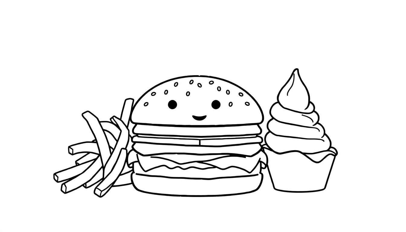 Duik in de wereld van heerlijke tekeningen met deze vrolijke kleurplaat! In het centrum pronkt een cartooneske hamburger, compleet met een stralende glimlach en een hoofd vol sesamzaadjes. Elke laag is duidelijk te onderscheiden, van het zachte broodje tot de sappige patty, de smeltende kaas en het knapperige sla. Deze charmante verschijning nodigt uit tot creativiteit, en met de extra’s aan weerszijden wordt het avontuur nog completer. Links schaart een stapel goudbruine frietjes zich naast de ster van de show, terwijl aan de rechterkant een verleidelijk dessert in een bakje wacht, getooid met een torenhoge, spiraalvormige toef slagroom. Dit is niet zomaar een kleurplaat; het is een uitnodiging tot een culinair tekenfeest!