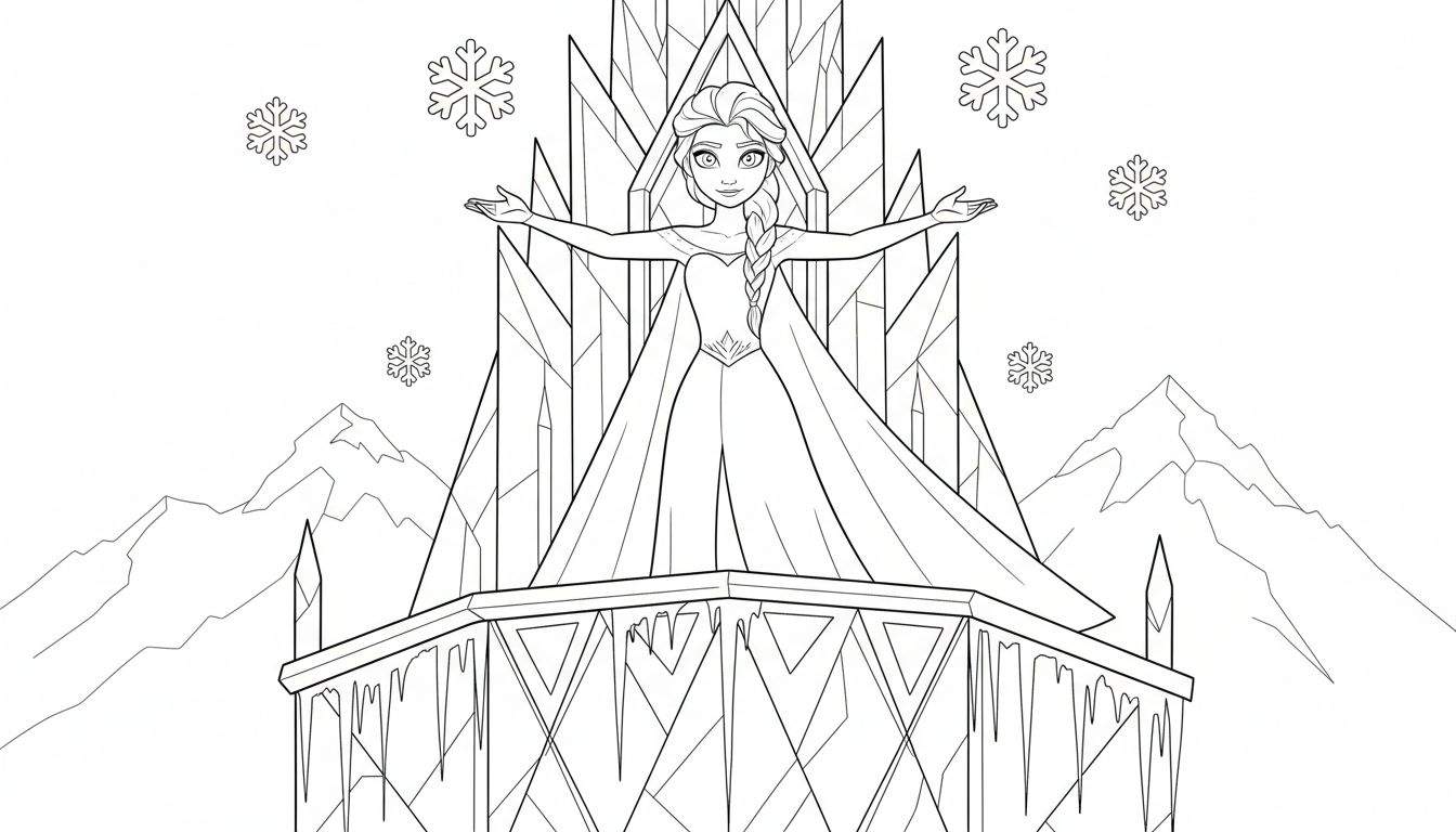Gratis kleurplaat van een jonge vrouw die lijkt op Elsa uit Frozen, staand op het balkon van een sprookjesachtig ijspaleis, met besneeuwde bergen op de achtergrond en zwevende sneeuwvlokken. Perfect voor urenlang kleurplezier!