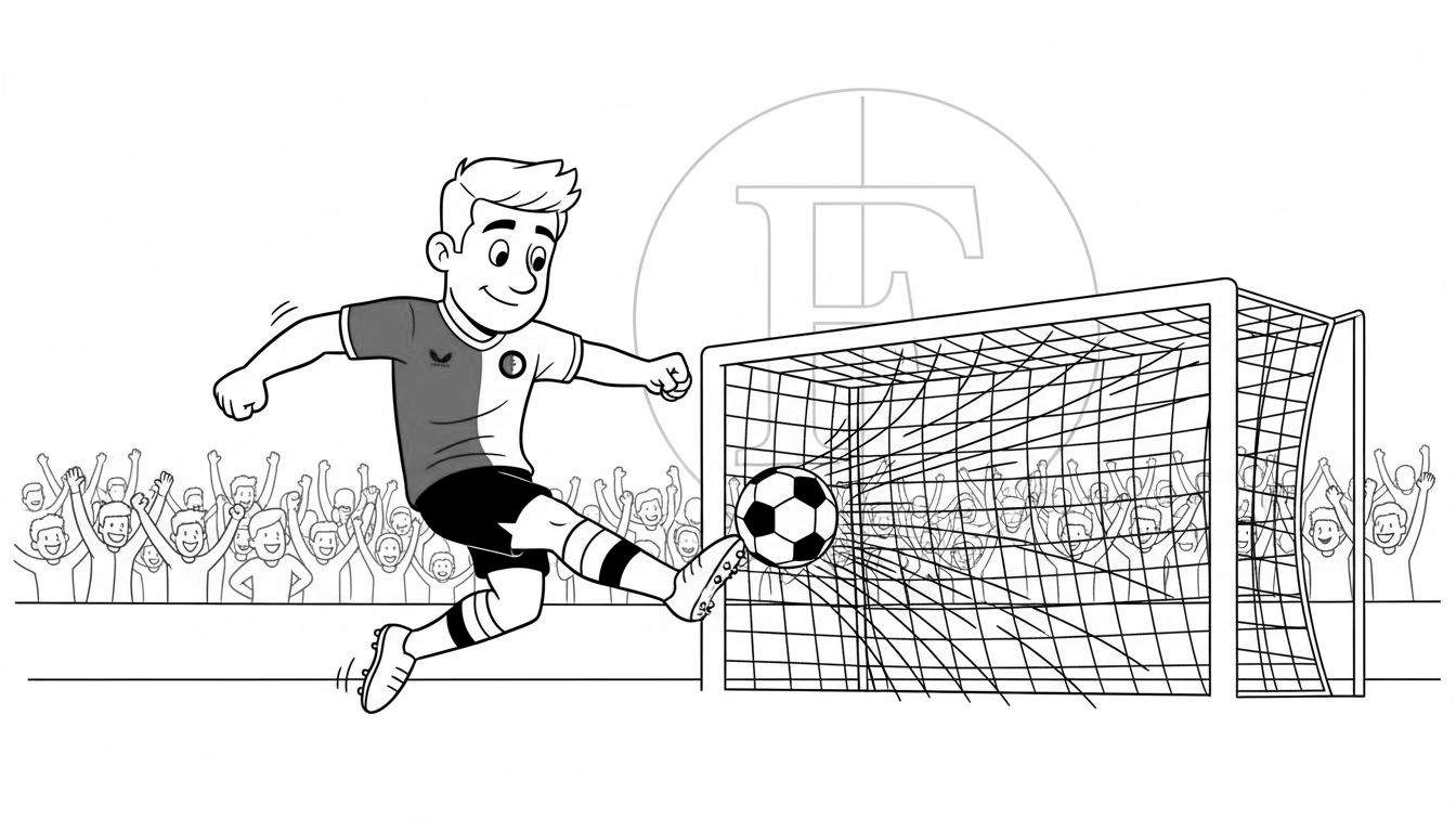 Wat is er mooier dan het moment waarop de bal met een doffe klap in het net verdwijnt en het stadion explodeert van vreugde? Deze prachtige kleurplaat vangt precies die euforie. Centraal staat een stralende, lachende jongen, die met de passie van een echte prof, de bal met ongelofelijke kracht tegen de touwen jaagt. Zijn voetbaltenue, deels klaar om ingekleurd te worden, en het discrete logo in de hoek laten er geen twijfel over bestaan: dit is een ode aan Feyenoord, de club van het volk.