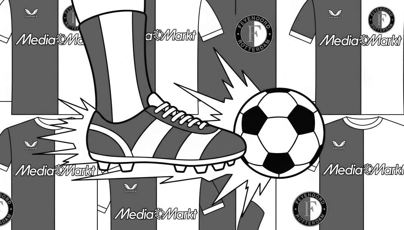 Duik in de dynamische wereld van Feyenoord met deze gedetailleerde zwart-witte kleurplaat. Op de voorgrond staat een krachtige voetbalschoen met noppen, vergezeld van een klassieke voetbal met zijn kenmerkende zeshoekige en vijfhoekige vlakken. Explosie-achtige lijnen rondom de schoen en bal suggereren actie en impact, perfect voor jonge en oude voetbalfans om hun creativiteit de vrije loop te laten. De achtergrond toont een herhalend patroon van iconische Feyenoord-shirts, verticaal gesplitst in donkergrijs en wit. Elk shirt is voorzien van het gevleugelde Castore logo, de sponsornaam ‘Media Markt’ op de borst en het onmiskenbare ronde clublogo met de letter ‘F’ en de tekst ‘FEYENOORD ROTTERDAM’. Een must-have voor elke Feyenoord-supporter!