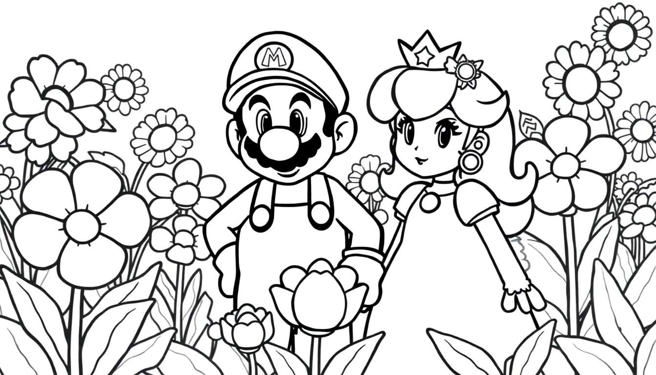 Deze vrolijke zwart-wit lijntekening is een kleurplaat met Mario en Prinses Peach in een weelderig bloemenveld. Mario, herkenbaar aan zijn rode pet met ‘M’, snor en tuinbroek, staat aan de linkerkant en houdt een bloemknop vast. Prinses Peach staat aan de rechterkant, sierlijk met haar kroon, oorbellen en jurk. Het bloemenveld is rijkelijk gevuld met diverse bloemen en bladeren, wat zorgt voor een levendige en vriendelijke sfeer.