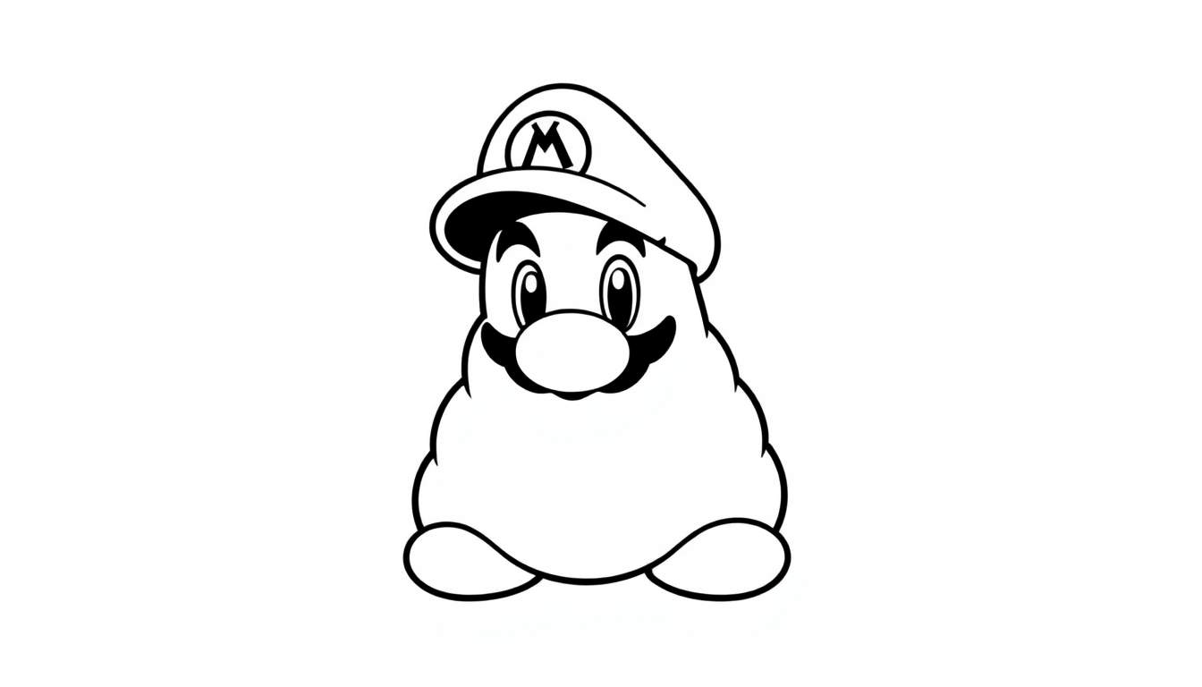 Deze charmante kleurplaat toont een figuur dat direct de aandacht trekt door zijn sterke gelijkenis met Nintendo’s geliefde loodgieter, Mario. Met zijn kenmerkende pet voorzien van de iconische letter ‘M’, grote vriendelijke ogen, een prominente neus en een vrolijke snor, is dit een herkenbaar en geliefd personage. De tekenstijl is heerlijk vereenvoudigd en gestileerd, bijna als een schattige ‘blob’ of ‘chibi’-versie, wat het ideaal maakt voor jongere kleurders en iedereen die van een minimalistische, strakke lijntekening houdt. De simpele, bolvormige lichaamsstructuur en de kleine uitstulpingen als voeten dragen bij aan de speelse en toegankelijke uitstraling.