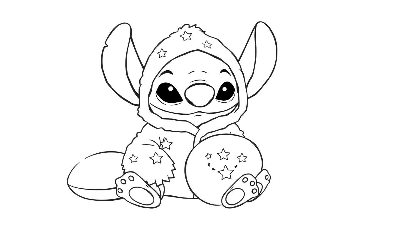 Een charmante zwart-wit lijntekening van Stitch, het geliefde Disney-figuur, die zittend op de grond een zachte hoodie draagt versierd met sterren. Hij houdt een bal vast met vier sterren, die doet denken aan een Dragon Ball. Perfect om in te kleuren!