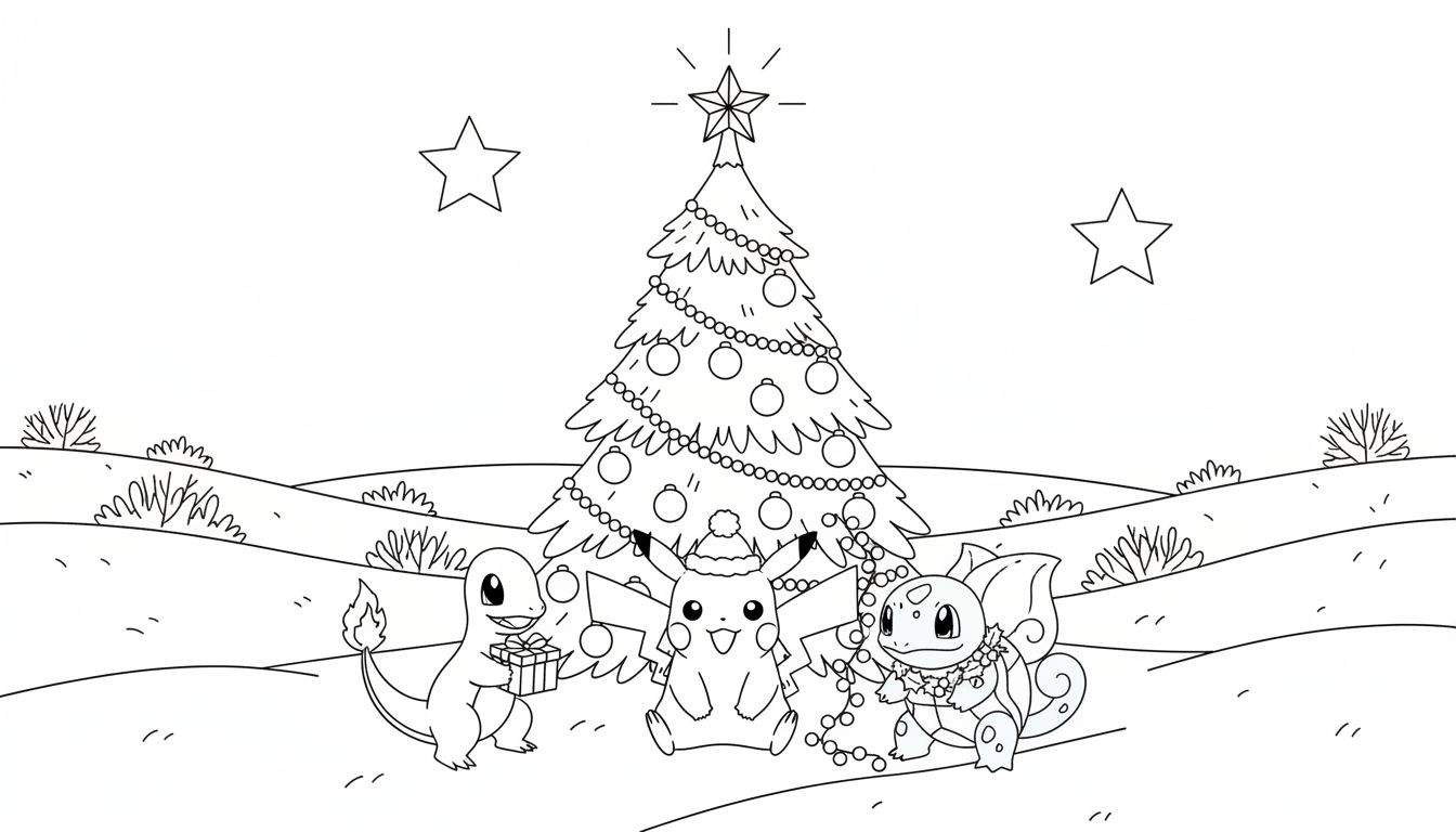 Deze betoverende zwart-wit kleurplaat brengt de geliefde Pokémon Pikachu, Charmander en Squirtle samen voor een onvergetelijke kerstviering. Centraal staat een grote, rijkelijk versierde kerstboom, bekroond met een fonkelende ster en versierd met ballen en slingers. Pikachu, met een schattige kerstmuts op zijn hoofd, zit vol verwachting voor de boom. Aan zijn zijden vinden we Charmander, die een mooi ingepakt cadeautje vasthoudt, en Squirtle, die speels met een kerstslinger of kerstverlichting speelt die om zijn nek is gewikkeld. De omgeving is een idyllisch, heuvelachtig winterlandschap, bedekt met een dikke laag sneeuw, met hier en daar gezellige bosjes. Twee extra sterren aan de hemel maken het feestelijke tafereel compleet en stralen een warme gloed uit in de koude winterlucht.