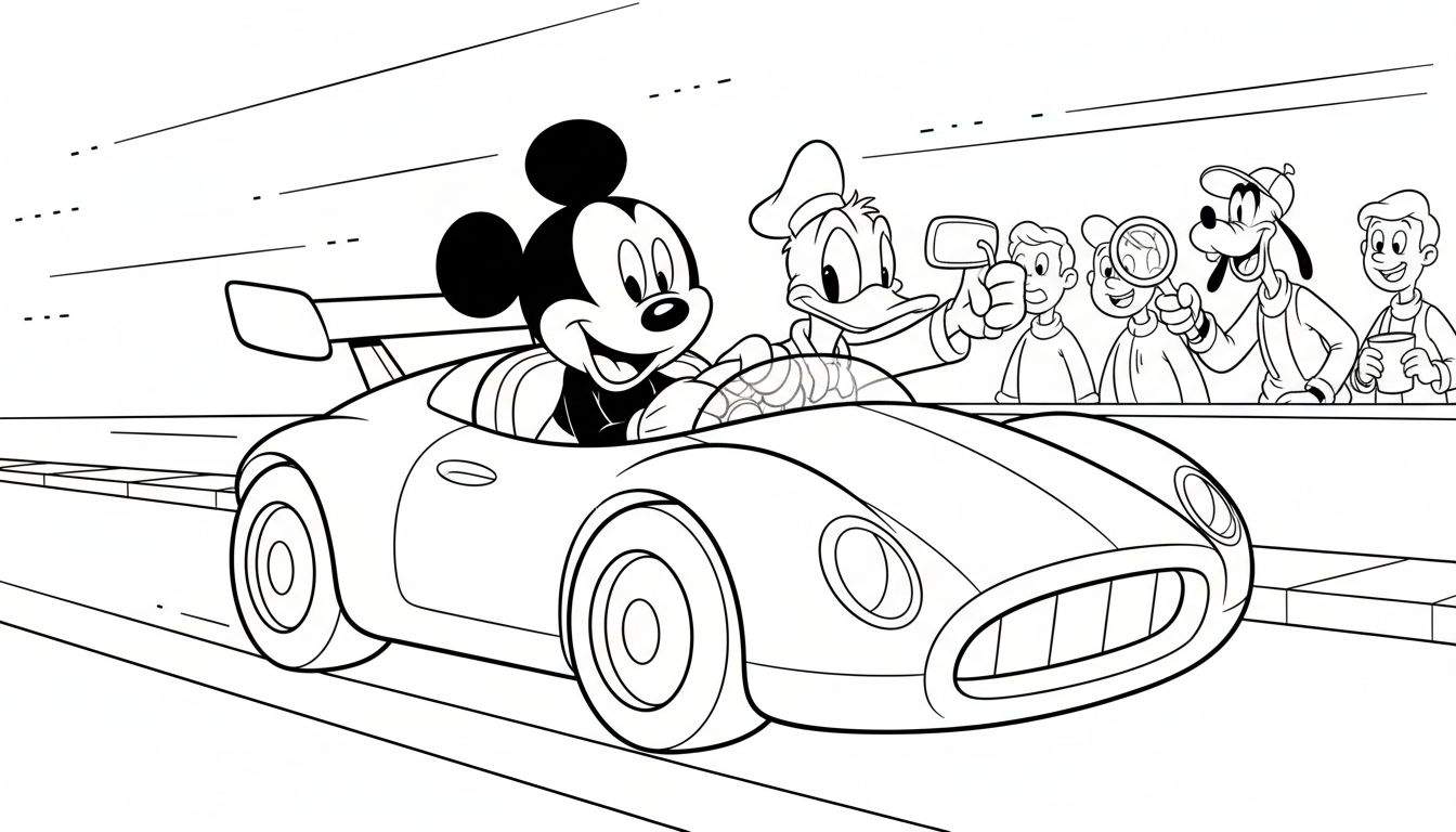 Een vrolijke zwart-wit kleurplaat van Disney-figuren! Mickey Mouse racet in een sportwagen met Donald Duck ernaast. Goofy en vrienden kijken vanaf de zijlijn toe met vergrootglazen en een drankje. Perfect voor jonge fans om in te kleuren!