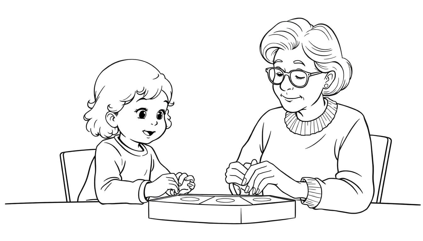Deze kleurplaat toont een gezellige scène van een jong meisje met krullend haar en een oudere vrouw, waarschijnlijk haar oma, die samen aan een tafel zitten en een bordspel of sorteeractiviteit doen. Beide kijken geconcentreerd naar het spel, hun handen klaar om een zet te doen. Een perfecte kleurplaat om de band tussen generaties te vieren en fantasie te stimuleren.