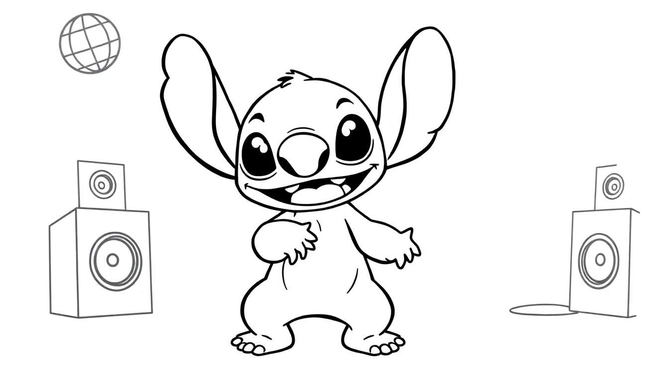 Gratis kleurplaat van Stitch, het vrolijke buitenaardse wezentje van Disney, die danst op muziek. Deze zwart-wit tekening is perfect om in te kleuren en bevat ook luidsprekers en een wereldbol.