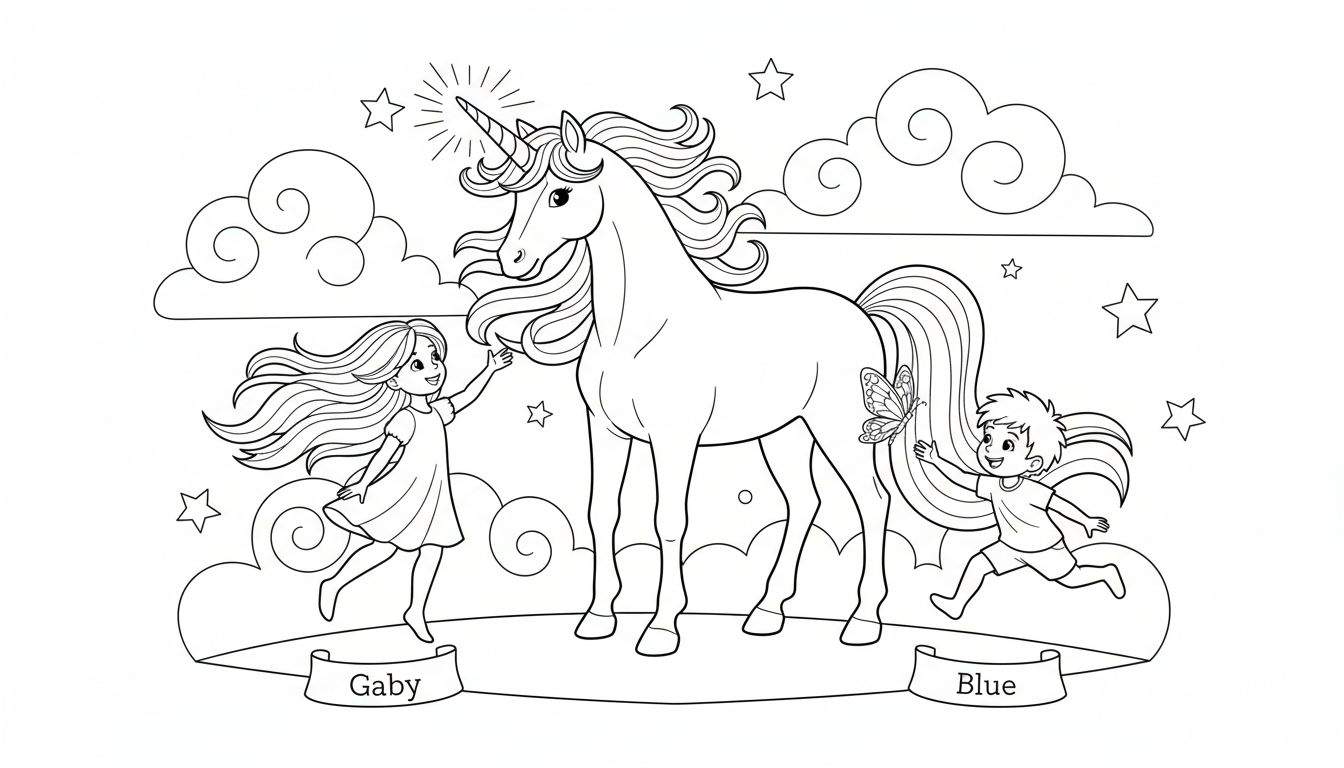 Een betoverende kleurplaat van een majestueuze eenhoorn, omringd door de vrolijke kinderen Gaby en Blue. Perfect voor uren kleurplezier met een fantasievolle achtergrond van wolken en sterren.