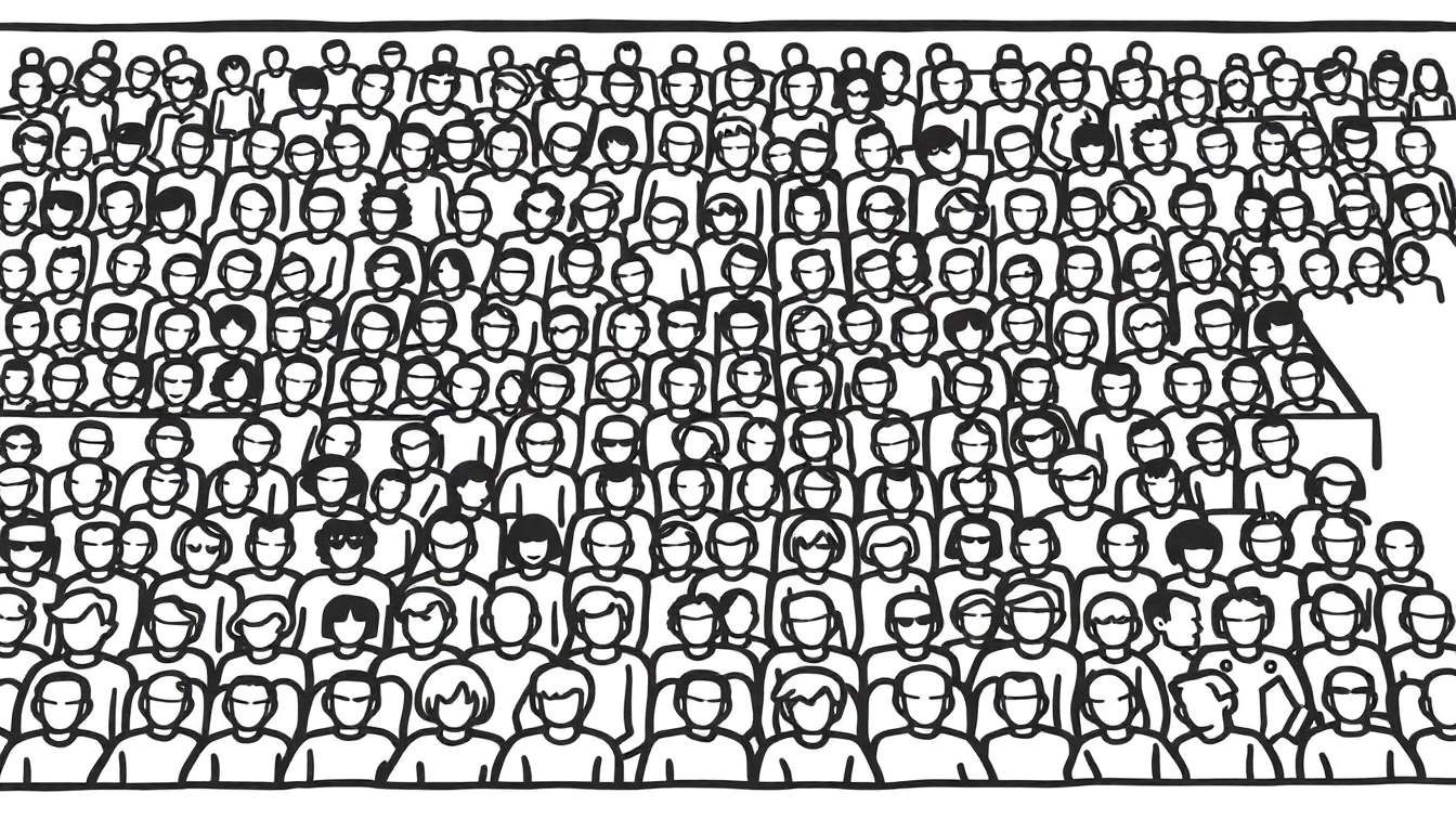 Een eenvoudige, zwart-wit lineaire kleurplaat die een dichte menigte mensen weergeeft, georganiseerd in trapsgewijze rijen. Perfect voor creatieve inkleuring van publieksscènes.