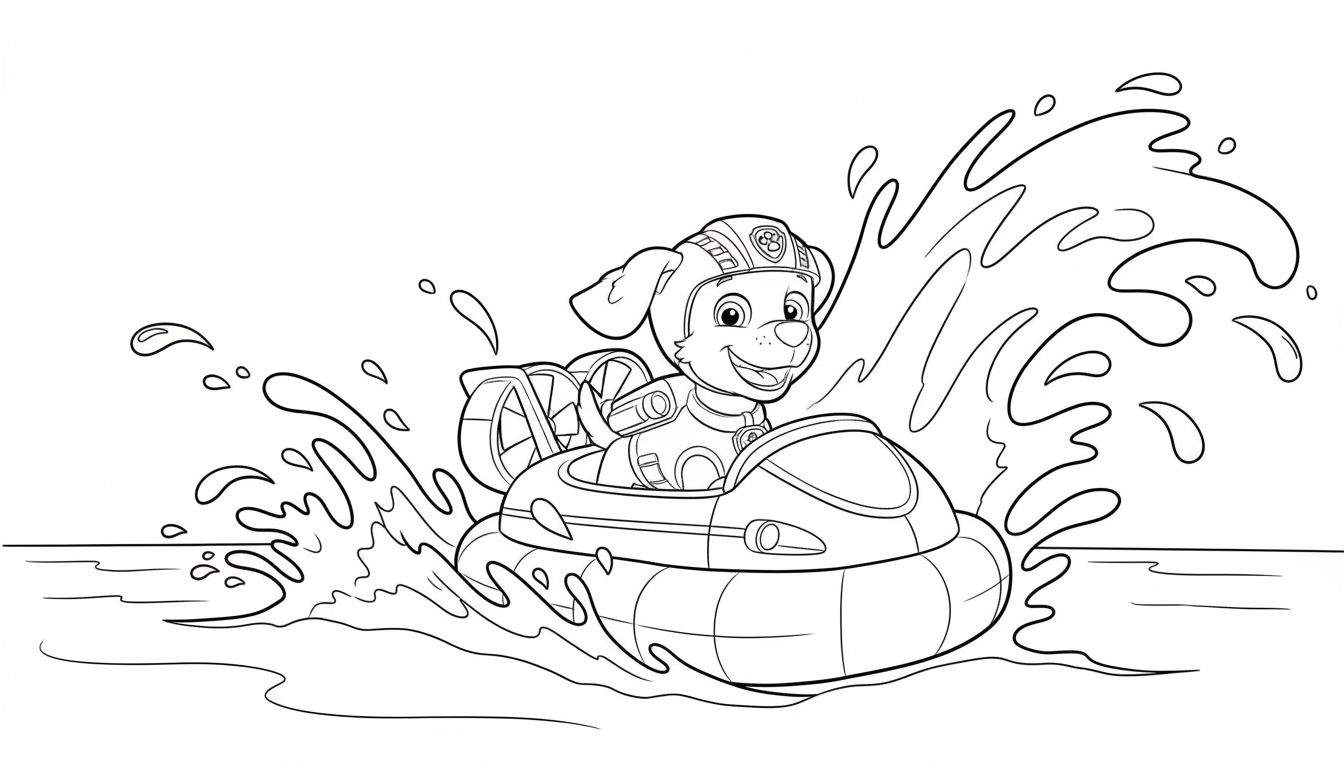 Een dynamische zwart-wit kleurplaat van Zuma van Paw Patrol, de vrolijke labrador. Hij zit in zijn kenmerkende oranje waterscooter of hovercraft, lachend en klaar voor actie. Zuma draagt zijn duikhelm met een Paw Patrol-embleem en een bijpassend pak. Het voertuig snijdt snel door het water, omringd door expressieve golven en opspattende waterdruppels, met een duidelijk zichtbare propeller aan de achterzijde.