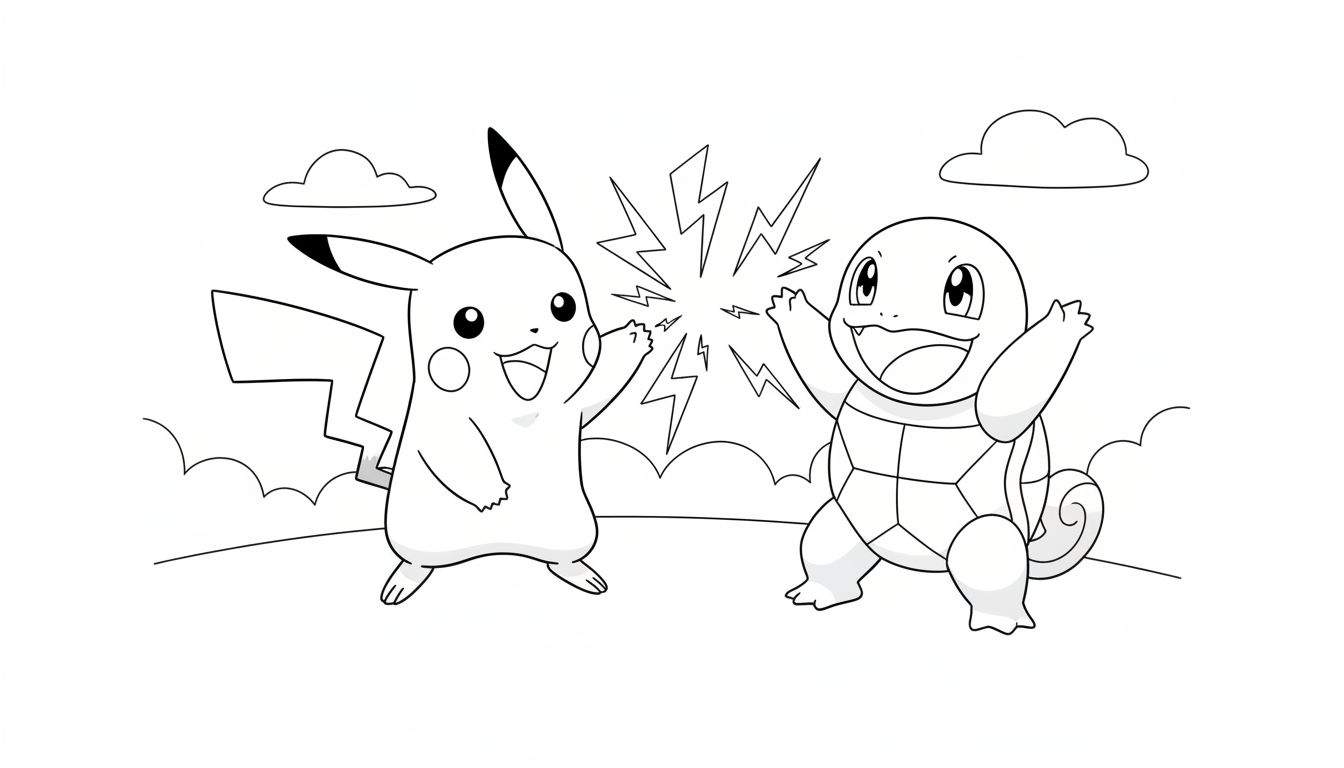 Duik in de wereld van Pokémon met deze fantastische zwart-wit lijntekening, perfect als kleurplaat! Deze plaat toont twee van de meest geliefde Pokémon: de elektrische Pikachu en de water-type Squirtle. Pikachu staat aan de linkerkant, lachend met zijn karakteristieke zigzagstaart, terwijl Squirtle vrolijk aan de rechterkant poseert, trots op zijn schild en krulstaart. Ze staan tegenover elkaar, elk met een omhooggestoken handje/poot, en daartussen barst een indrukwekkende energie-explosie van bliksemschichten los. Dit kan zowel een epische ‘high-five’ van vriendschap als een spannende voorbereiding op een gevecht symboliseren. De eenvoudige achtergrond met wolken en een golvende grondlijn zorgt ervoor dat alle aandacht naar onze twee helden gaat. Een ideale kleurplaat om je creativiteit de vrije loop te laten en deze iconische Pokémon tot leven te brengen met je favoriete kleuren!