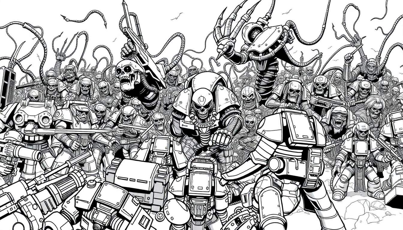 Een gedetailleerde zwart-wit kleurplaat in stripboekstijl die een massaal en dreigend leger van sci-fi/fantasy krijgers weergeeft. Grote, zwaar gepantserde figuren met schedelhelmen voeren de aanval aan, terwijl een enorme menigte van kleinere, even sinistere wezens hen volgt. Kenmerkend zijn de alomtegenwoordige schedelmotieven, biomechanische tentakels en futuristische wapens. De scène ademt een sfeer van dystopische oorlog en duistere vernietiging.