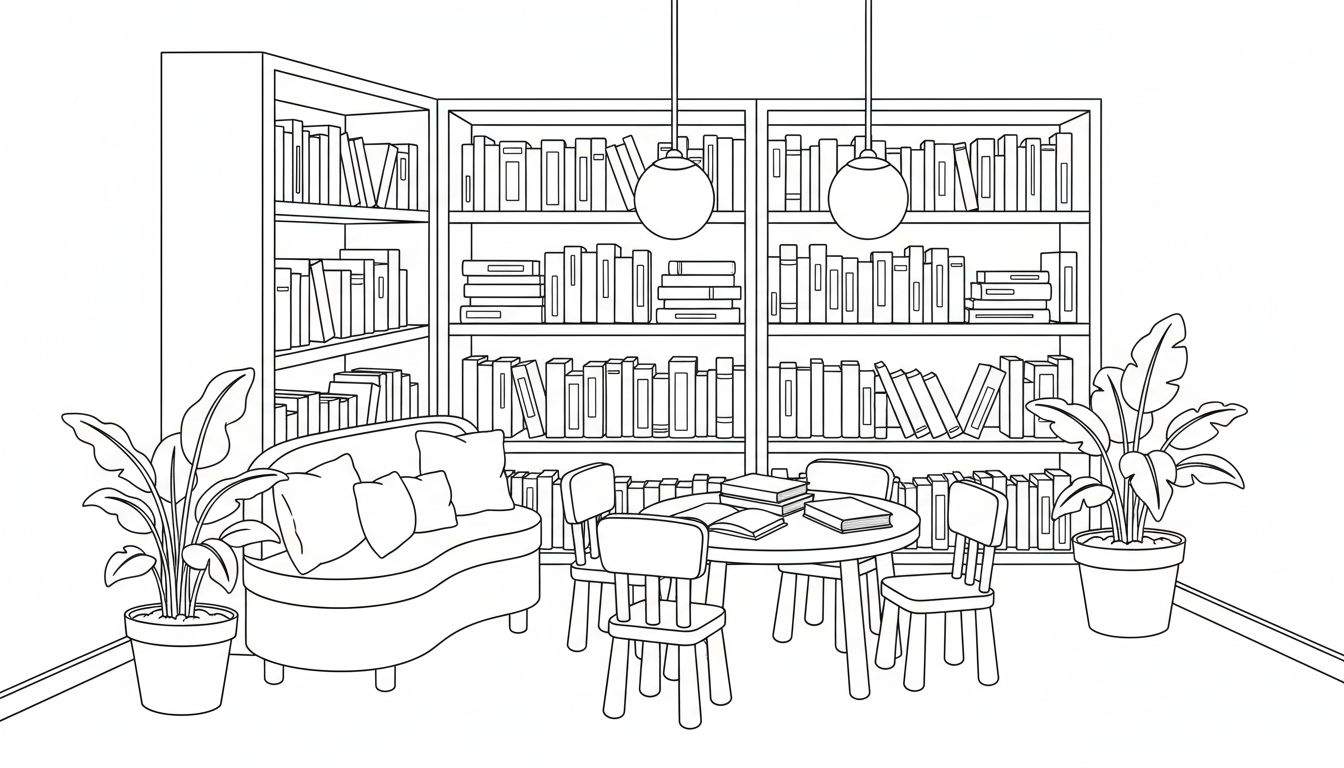 Een gedetailleerde zwart-wit lijntekening van een sfeervolle leeshoek of bibliotheekgedeelte, klaar om ingekleurd te worden. Perfect voor creatieve ontspanning.