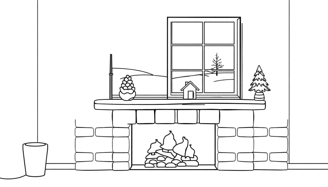 De blikvanger in deze scène is ongetwijfeld het grote raam, onderverdeeld in zes ruiten, dat uitkijkt op een betoverend winterlandschap. Stel je voor dat je de sneeuwvlokken ziet dwarrelen over glooiende, met sneeuw bedekte heuvels, terwijl een klein, knus huisje en een sierlijke, kale boom het tafereel vervolledigen. Aan de linkerkant van de haard staat een eenvoudige emmer, een klein detail dat de realiteit van het interieur benadrukt. Deze tekening, met zijn lege achtergrond, is een blanco canvas voor jouw verbeelding, wachtend om gevuld te worden met kleur en leven.