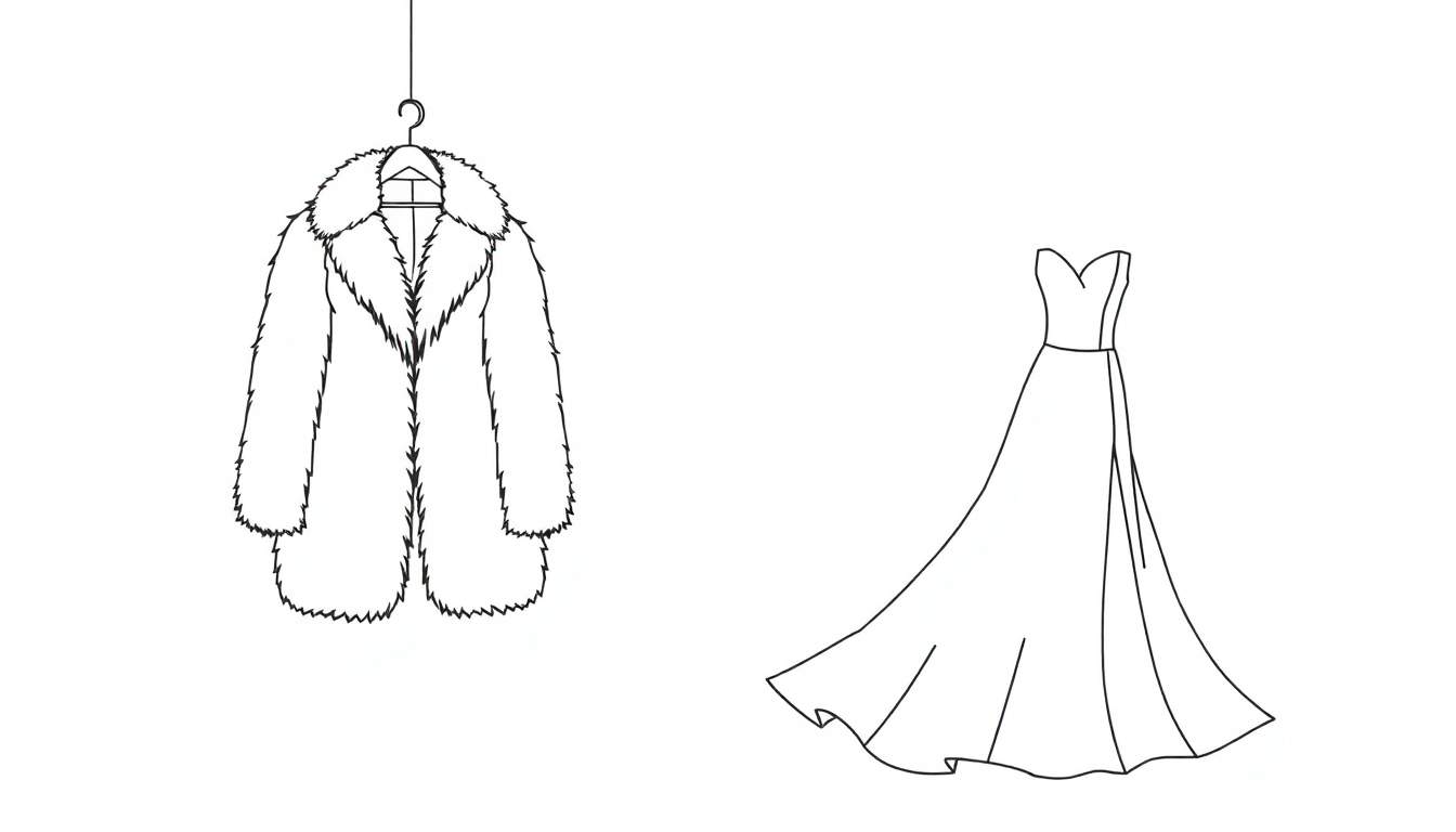 Download deze gratis kleurplaat met een gedetailleerde lijntekening van een luxe, pluizige jas aan een hanger en een elegante, strapless avondjurk met hartvormige halslijn en wijd uitlopende rok. Perfect voor creatieve projecten!