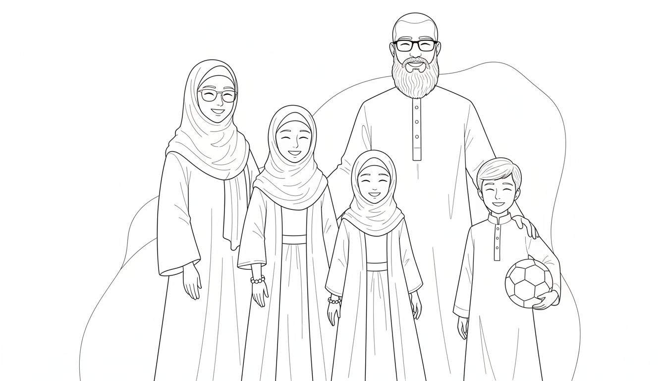 Deze sfeervolle kleurplaat toont een liefdevol islamitisch gezin van vijf personen. De centrale figuur is de vader, herkenbaar aan zijn volle baard, bril en traditionele gewaad. Naast hem staan twee vrouwen: een oudere vrouw met een hijab en bril, en een jongere vrouw met ook een hijab en versierd met armbandjes. Aan de andere zijde van de vader zien we een jong meisje, eveneens in een gewaad en met armbandjes. De jongen, die de man omarmt, draagt een traditioneel overhemd en houdt trots een voetbal vast. Iedereen in het gezin straalt pure vreugde uit met brede glimlachen, wat deze kleurplaat perfect maakt voor jonge kunstenaars.