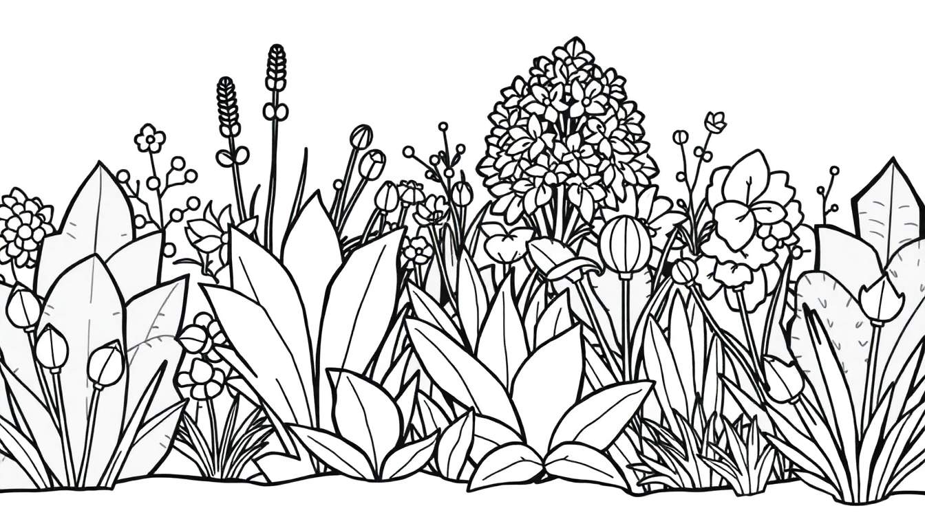 Gedetailleerde zwart-wit kleurplaat van een weelderige bloemenborder vol diverse bloemen, knoppen en bladeren. Perfect om creatief in te kleuren en uw eigen tuin te creëren.