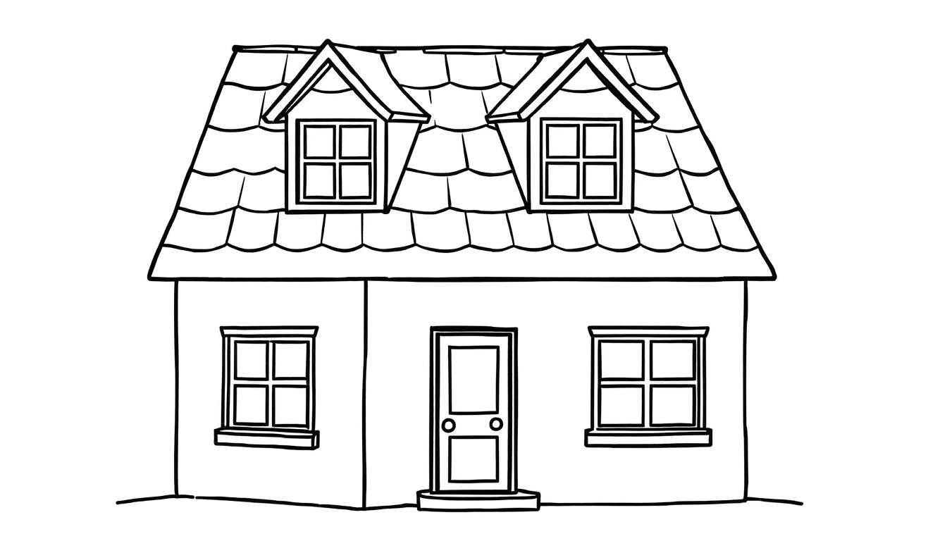 Download deze gratis kleurplaat van een charmant huis met een puntdak, dakkapellen en een klassieke voordeur. Perfect voor creatieve uurtjes!