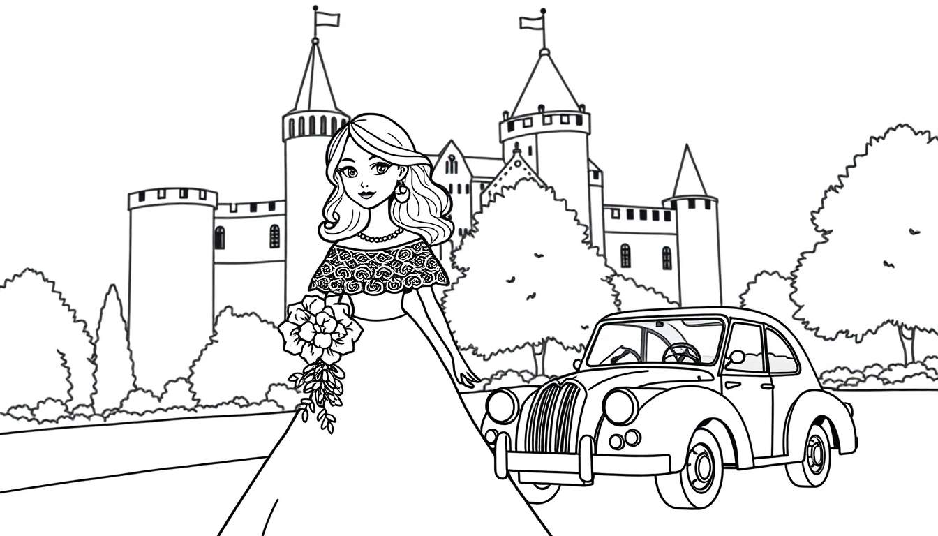 Stap in de wereld van sprookjes en elegantie met deze betoverende kleurplaat! Centraal staat een statige vrouw, gehuld in een weelderige jurk die doet denken aan een koninklijke bruid of een edele prinses. Haar jurk, met een prachtig gedetailleerd, kantachtig bovenstuk, straalt verfijning uit. Met haar golvende haar, sprankelende oorbellen en een elegante ketting, houdt ze fier een overvloedig bloemenboeket vast, klaar om elk detail met kleur tot leven te brengen. De omgeving is net zo sprookjesachtig: een klassieke, ronde vintage auto staat charmant te wachten, haar ronde vormen en grote koplampen een ode aan vervlogen tijden. Achter dit idyllische tafereel verheft zich een imposant kasteel, met majestueuze torens en wapperende vlaggen, deels verborgen door het weelderige groen van bomen en struiken die dit parkachtige landschap compleet maken. Een uitnodigende weg of pad op de voorgrond nodigt uit om de scène verder te verkennen.