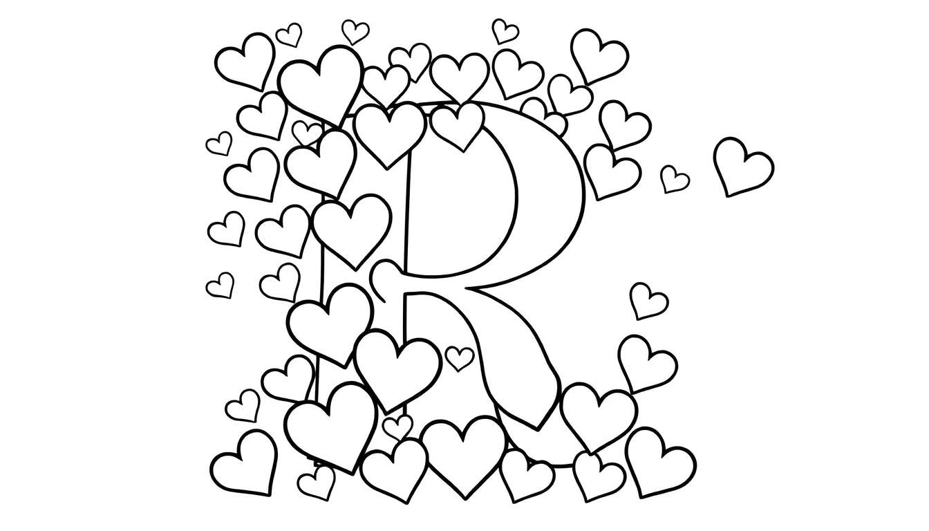 Een schattige zwart-wit lijntekening van de hoofdletter R, omringd door een zee van hartjes in verschillende groottes. Perfect om in te kleuren voor urenlang creatief plezier!
