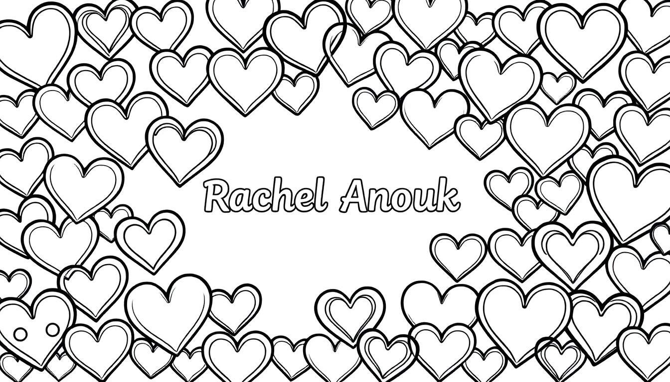 Download deze vrolijke, gepersonaliseerde kleurplaat met de naam ‘Rachel Anouk’ omringd door talloze harten. Perfect voor creatieve plezier!