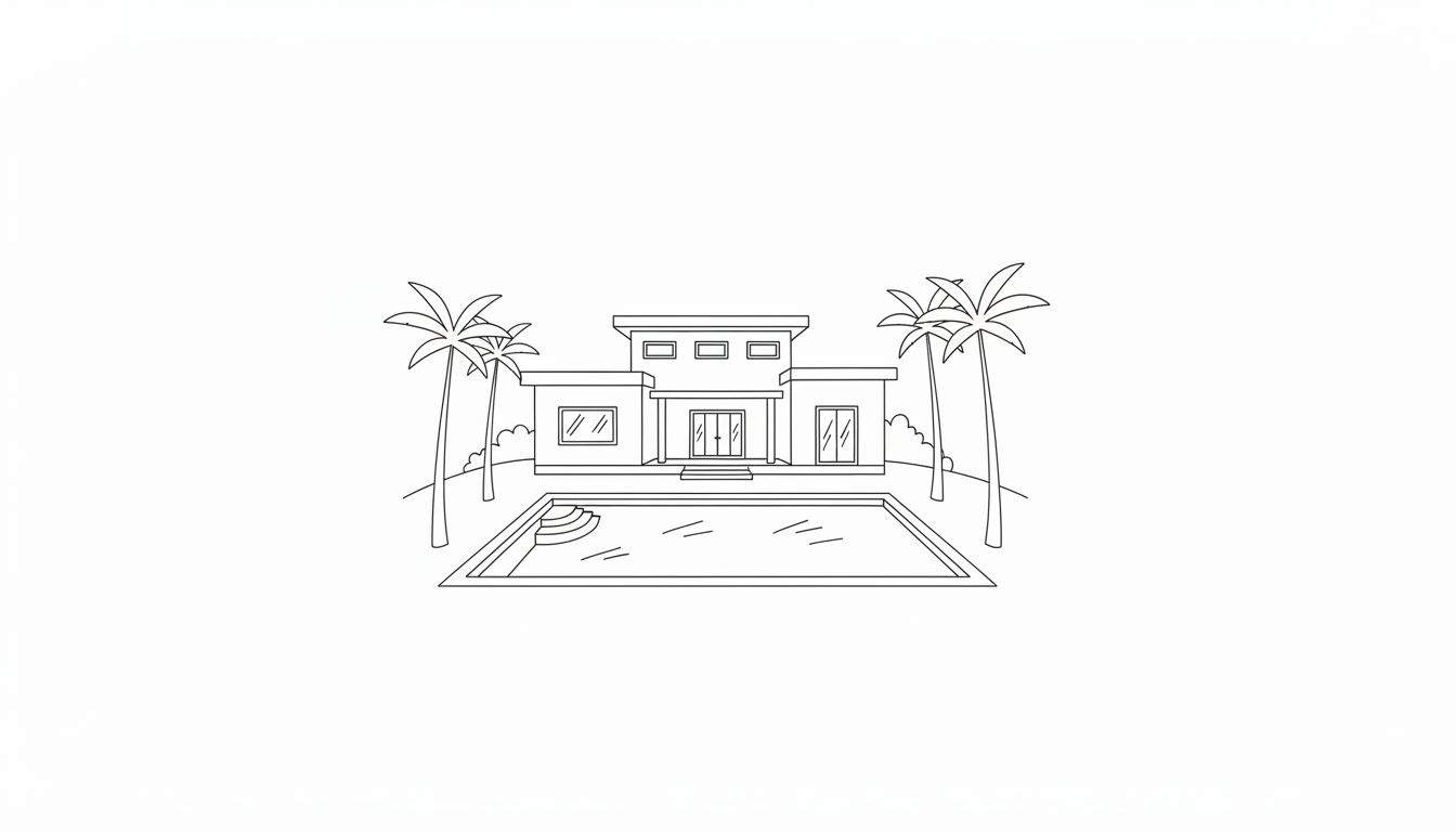 Wist je dat moderne architectuur vaak wordt gekenmerkt door open ruimtes en een sterke verbinding met de natuur? Dit huis, met zijn grote ramen en de ligging aan het zwembad, belichaamt dit perfect! Stel je voor dat dit huis ergens aan de Middellandse Zee staat, waar de zon altijd schijnt en de palmbomen zorgen voor de nodige schaduw. Welke kleuren zou jij kiezen voor de muren van het huis? Misschien een helder wit, een strak grijs, of juist een warme terracotta? En hoe zou je het zwembad maken? Lichtblauw voor een frisse look, of dieper turquoise voor een luxueus gevoel? De palmbomen zouden prachtig kunnen zijn met donkergroene bladeren, of misschien juist een lichtere, vrolijke tint groen. Je kunt zelfs denken aan de reflectie van de lucht en de palmbomen in het water. Laat je fantasie de vrije loop en creëer jouw unieke droomwereld!