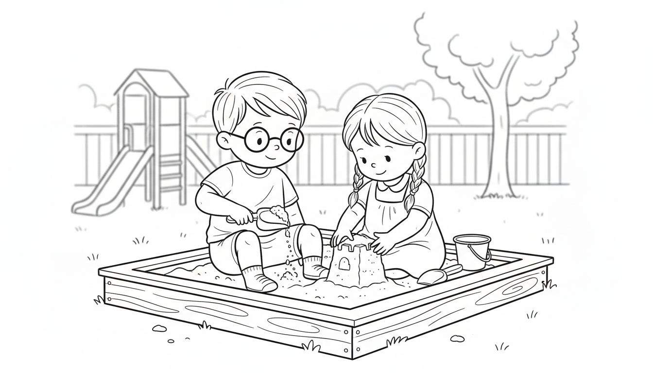 Gratis kleurplaat van twee lachende kinderen die zich vermaken in een zandbak. Een jongen met een bril schept zand, terwijl een meisje met vlechten een zandkasteel bouwt. Op de achtergrond zijn een speeltoestel, een boom en een hek te zien. Perfect voor uren tekenplezier!