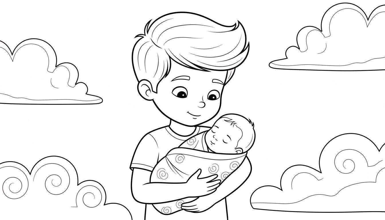 Een hartverwarmende zwart-wit tekening van een jongen die liefdevol een ingewikkelde baby vasthoudt. Perfect om de band tussen broers en zussen in te kleuren en te vieren. De gestileerde wolken op de achtergrond voegen een dromerige sfeer toe.