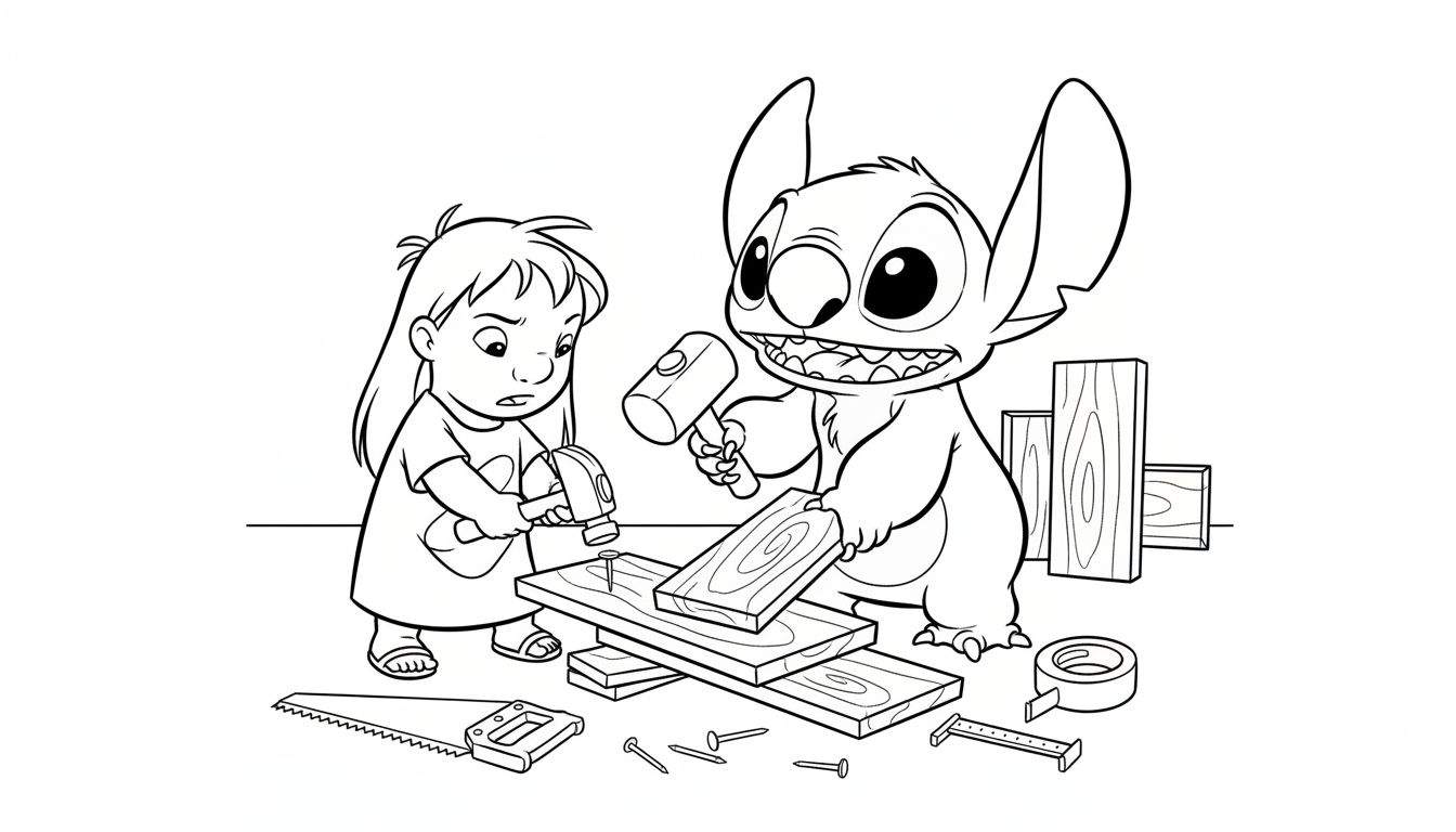 Een vrolijke zwart-wit kleurplaat van Lilo en Stitch die samen timmeren aan een project. Perfect voor jonge knutselaars om in te kleuren. Inclusief gereedschap zoals een hamer, spijkers, zaag en meetlint.