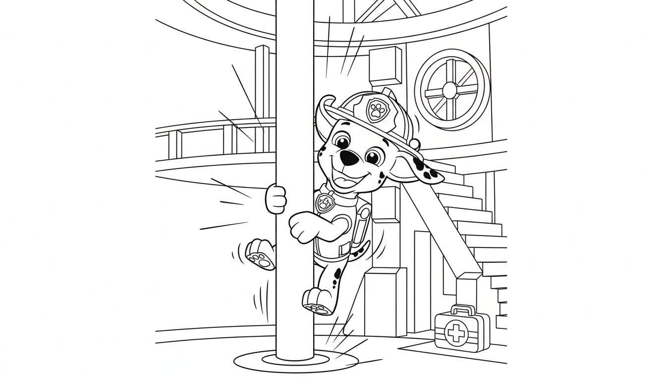 Een dynamische zwart-wit kleurplaat van Marshall van Paw Patrol. De Dalmatische brandweerhond glijdt lachend langs een verticale paal naar beneden, met streepjes die beweging en snelheid benadrukken. Hij draagt zijn rode brandweerhelm met pootafdruk en uniform. De scène speelt zich af in een gebouw, waarschijnlijk de Paw Patrol uitkijktoren of een brandweerkazerne, met een trap en een EHBO-koffer met rood kruis aan de rechterkant. Aan de linkerkant is een balustrade zichtbaar, wat suggereert dat hij van een hogere verdieping komt.